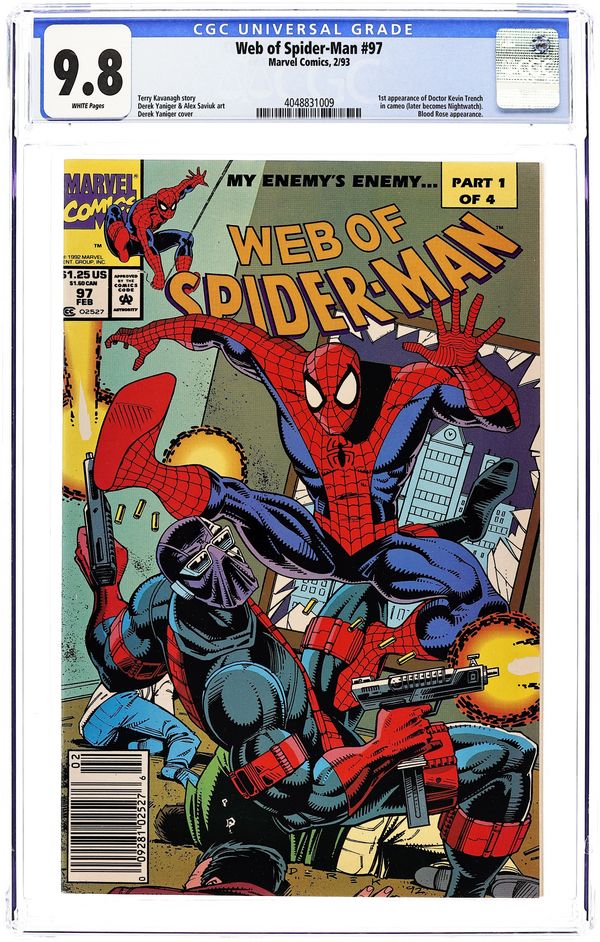 Starts Feb 16 Newsstand Edition. "Opening Volley" Part 1 of 4. Script by Terry Kavanagh. Pencils by Alex Saviuk and Derek Yaniger. Inks by Joe Rubinstein and Derek Yaniger. Cover by Derek Yaniger. The Blood Rose is back! And he's doing what he does best…terrorizing the Kingpin's crime syndicate! In a bold move, the Blood Rose attacks the Fisk Tower and sets it on fire! The Amazing Spider-Man and Joe Robertson rush to the scene and find complete carnage inside! And of course find the Blood Rose inside too…still firing away at anything that moves! Meanwhile on a Caribbean Island, a beleaguered man closely resembling Richard Fisk washes ashore. First appearance of Nightwatch (aka Dr. Kevin Trench). Cameo appearances by the Foreigner, Alfredo Morelli, and Peter Parker's (robot) parents. (Notes: This issue begins the four-part My Enemy's Enemy storyline. The Blood Rose previously appeared in Web of Spider-Man 89. This issue includes a full-page cover preview for Web of Spider-Man 98.) 32 pages Cover price $1.25. Grade: CGC 9.8 explanation of grade Condition: Used (collectible)