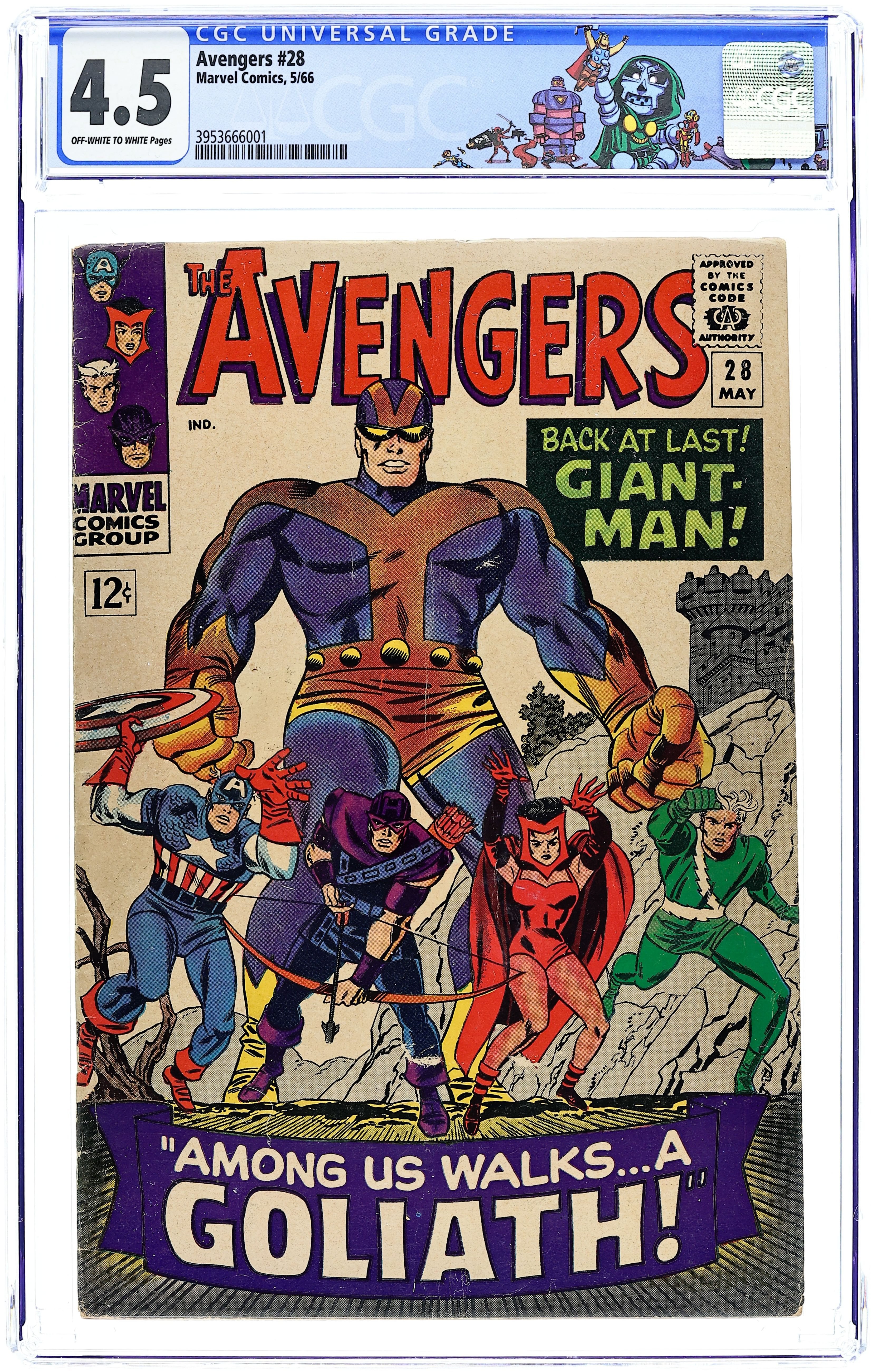 Cover pencils by Jack Kirby, inks by Frank Giacoia. Giant-Man becomes Goliath and, along with the Wasp, rejoins the Avengers in "Among Us Walks... a Goliath!", script by Stan Lee, art by Don Heck; Henry Pym calls the Avengers, saying the Wasp is missing, and that he is Giant-Man; The Wasp has been captured by the Collector and the Beetle; Giant-Man renames himself Goliath; They enter the Collector's lair and get separated and captured; Goliath escapes and frees the other Avengers; They rescue the Wasp and force the Collector to escape with the Beetle using a time machine; However, when Goliath tries to shrink down to his normal size he collapses and faints at 10 feet tall; First appearance of The Collector. Avengers roll call: Captain America, Hawkeye, Quicksilver, and the Scarlet Witch. Reprinted in Marvel Triple Action #22. 36 pgs., full color. $0.12. Cover price $0.12. Grade: CGC 4.5 explanation of grade Condition: Used (collectible)