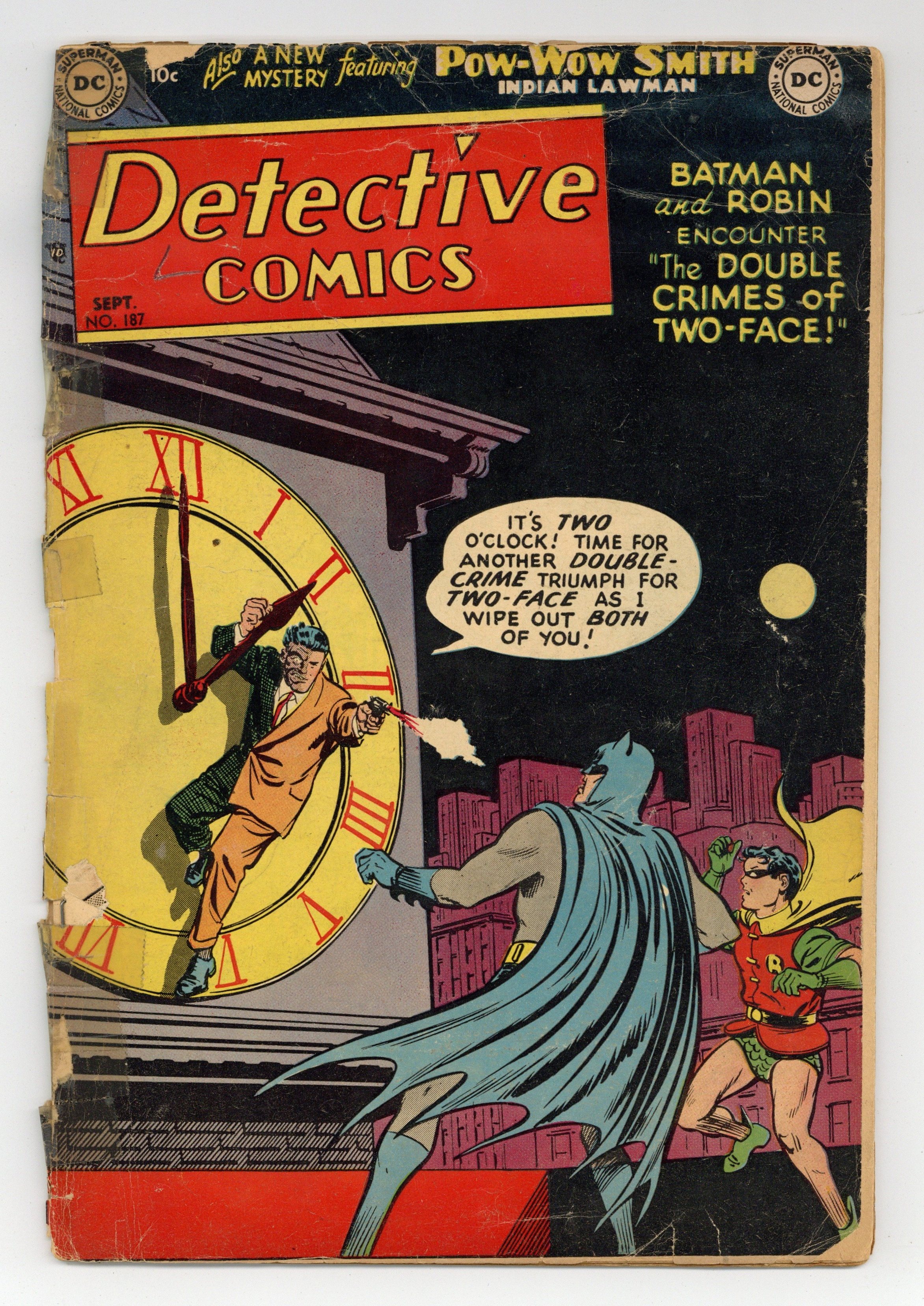 Cover by Win Mortimer. Stories by Don C. Cameron and unknown. Art by Dick Sprang, Charles Paris, Leonard Starr, Ruben Moreira and unknown. Batman and Robin encounter..."The Double Crimes of Two-Face!" by Don C. Cameron, Dick Sprang and Charles Paris. Plus: Pow-Wow Smith, Indian Lawman in "The Man from Scotland Yard!" with art by Leonard Starr; Robotman in "The Man Who Insured Robotman!"; and Impossible -- But True! tale "The First Talking Dog!" (featuring Roy Raymond) with art by Ruben Moreira. Also: Little Pete half-pager by Henry Boltinoff; Casey the Cop 1-pager by Boltinoff; and 2-page text piece "Secrets of Code" by Bob Lanza. 44 pages, full color. Cover price $0.10. Grade: PR 0.5 explanation of grade Condition: Used (collectible)
