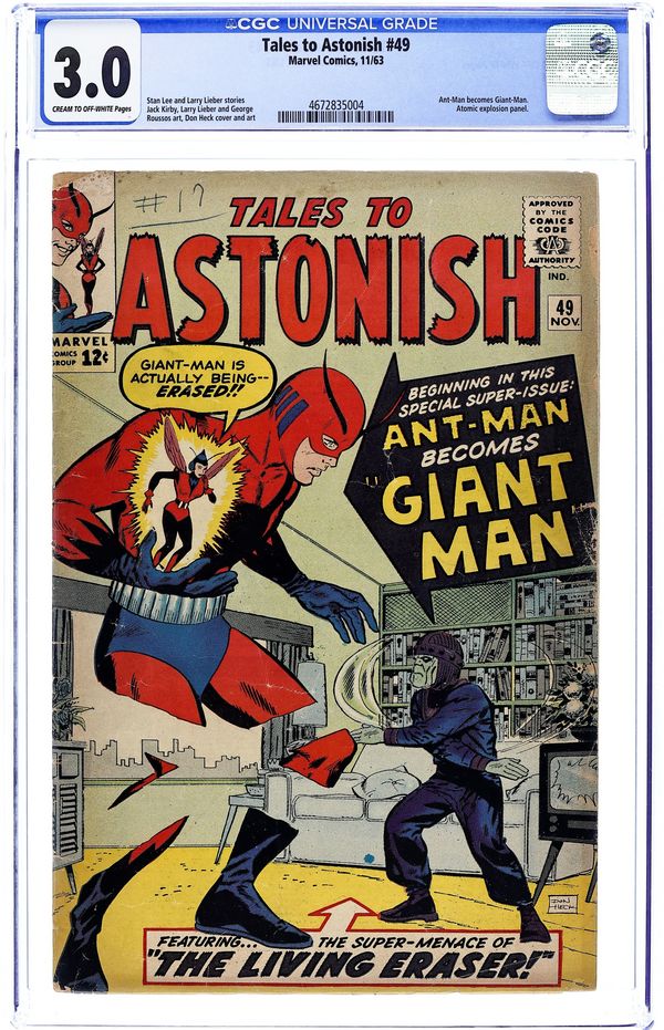 Cover by Don Heck. The Birth of Giant-Man!, script by Stan Lee, art by Jack Kirby and Don Heck; While Henry Pym develops capsules that permit him to become giant-size as well as ant-size, the Eraser captures him and brings him to Dimension Z along with other scientists to build atomic weapons. Odd Skills text story, art by Joe Maneely. The End of a World!, script by Stan Lee and Larry Lieber, art by Larry Lieber and George Roussos [as G. Bell]; A ruler orders the destruction of an uninhabited galaxy as a tribute to his power. 36 pgs., full color. $0.12. Cover price $0.12. Grade: CGC 3.0 explanation of grade Condition: Used (collectible)