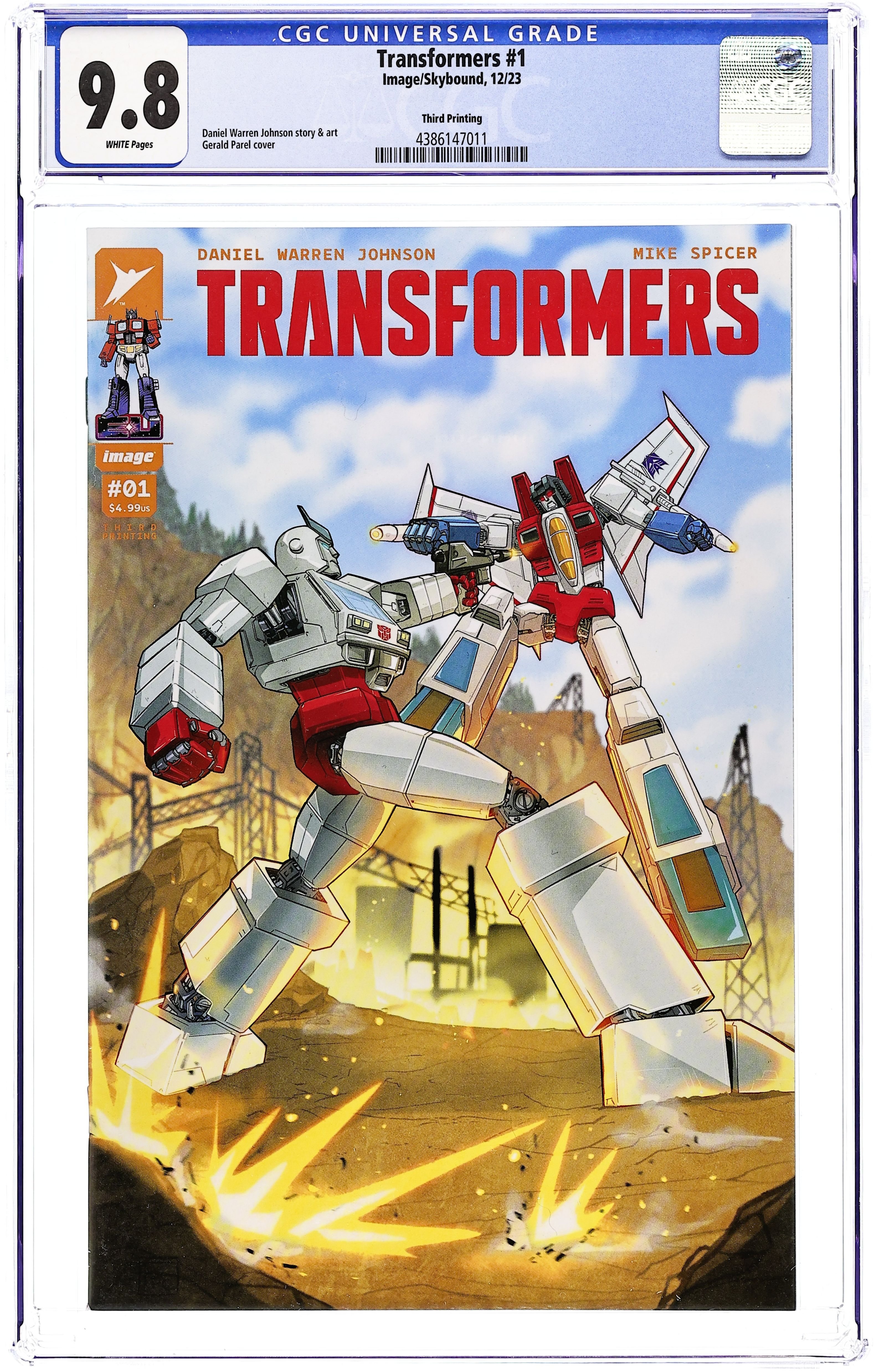 Starts Feb 16 3rd Printing. Written by Daniel Warren Johnson. Art by Mike Spicer, Daniel Warren Johnson. Cover by Gerald Parel. SERIES PREMIERE THE ALL NEW TRANSFORMERS ERA STARTS HERE! Superstar creator DANIEL WARREN JOHNSON (DO A POWERBOMB, Wonder Woman: Dead Earth), alongside ENERGON UNIVERSE showrunner ROBERT KIRKMAN (VOID RIVALS, INVINCIBLE), reimagines Hasbro's robots in disguise for a brand-new generation. Optimus Prime was supposed to have led the Autobots to victory. Instead, the fate of Cybertron is unknown, and his allies have crash-landed far from home, alongside their enemies-the Decepticons. As these titanic forces renew their war on Earth, one thing is immediately clear: the planet will never be the same. New alliances are struck. Battle lines are redrawn. And humanity's only hope of survival is Optimus Prime. Discover THE TRANSFORMERS like you've never seen them before! 36 pages, full color. Rated T Cover price $4.99. Grade: CGC 9.8 explanation of grade Condition: Used (collectible)