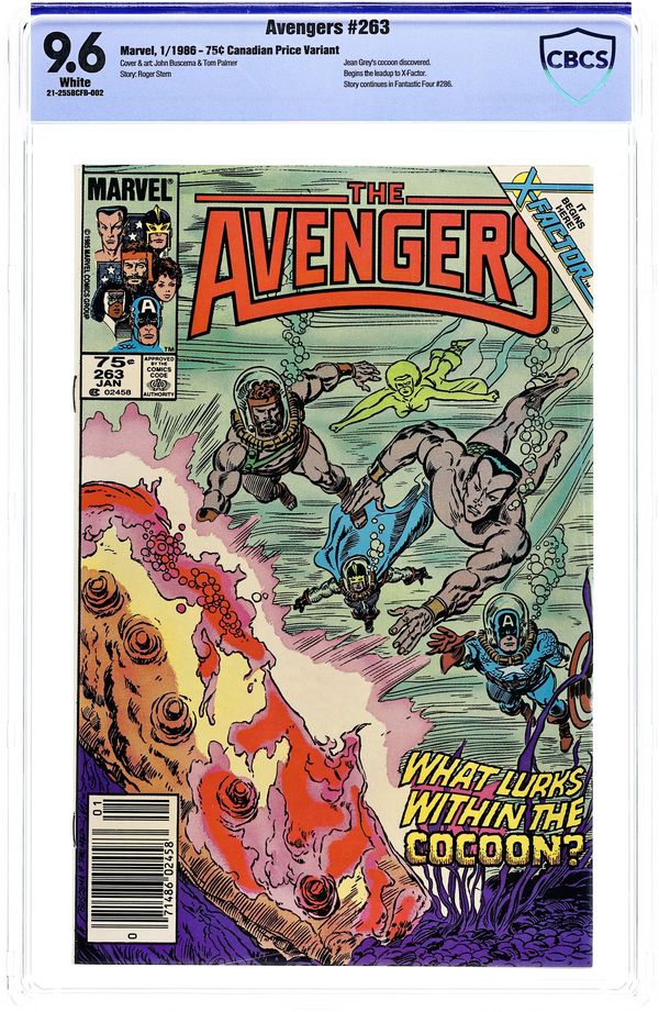 Canadian edition with $.75 cover price. Return of Jean Grey: Part 1 of 3 - "What Lurks Below?" X-Factor tie-in. Script by Roger Stern. Art by John Buscema (breakdowns) and Tom Palmer (finishes). Cover by John Buscema and Tom Palmer. While attempting to escape from the police, the Enclave's charter jet skids off the runway and crashes into Jamaica Bay! The plane erupts into a giant fireball, but one piece of cargo safely sinks to the bottom of the bay. Captain Marvel is the first avenger on the scene and finds a strange energy cocoon half-buried in the bay floor. Did the cocoon come from the Enclave's plane or has it been resting at the bottom of the bay for several years? The Avengers investigate further and discover that a sentient being is inside the sunken capsule! After bringing the capsule back to Avengers Mansion, the mystery grows! Story continues in Fantastic Four 286. Cameo appearances by Jean Grey, Scourge, and the Melter. Flashback cameos by Adam Warlock and Her (aka Kismet). Avengers Lineup: Black Knight, Captain America, Captain Marvel, Hercules, Sub-Mariner, and the Wasp. Last 65ยข issue. (Note: Jean Grey (aka Marvel Girl) previously appeared in Uncanny X-Men 100.) Story acontinues in Fantastic Four (1961-1996 1st Series) #286. Cover price $0.75. Grade: CBCS 9.6 explanation of grade Condition: Used (collectible)