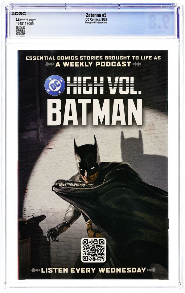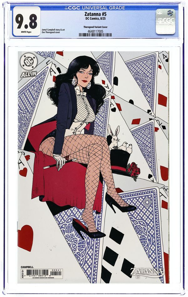Limited 1 for 25 Retailer Incentive Variant Cover. Written by Jamal Campbell. Art by Jamal Campbell. Cover by Zoe Thorogood. THE PENULTIMATE CHAPTER OF ZATANNA'S STORY IS HERE! The trap is sprung. All cards are drawn. The guillotine descends. As a tragic tale of loss and demise is told, Zatanna has one chance to discover the secrets of the cursed sword, regain control over the narrative, and save herself. If not, when the story concludes, so does her life! Cover price $4.99. Grade: CGC 9.8 explanation of grade Condition: Used (collectible) unless item is a new release