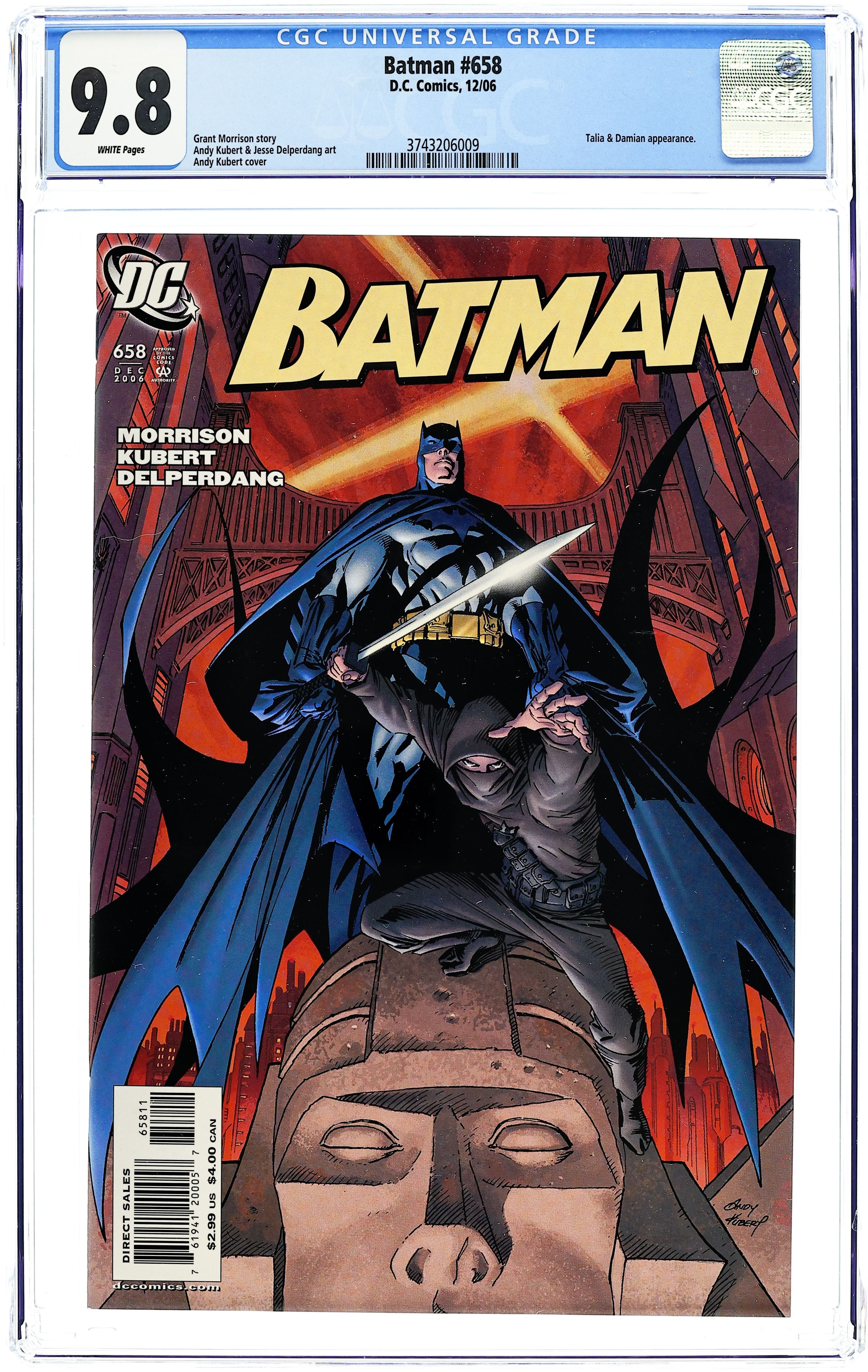 Cover by Andy Kubert. "Batman & Son Part 4 Absent Fathers," script by Grant Morrison, pencils by Andy Kubert, inks by Jesse Delperdang; Damian's presence at Wayne Manor a distraction for Batman. In trying to prove himself to his father, Damian attacks Alfred, murderes the Spook and almost kills Robin; Bruce has to stop Talia from using an army of Man-Bats against the British government. 36 Pages, Full Color. Cover price $2.99. Grade: CGC 9.8 explanation of grade Condition: Used (collectible)