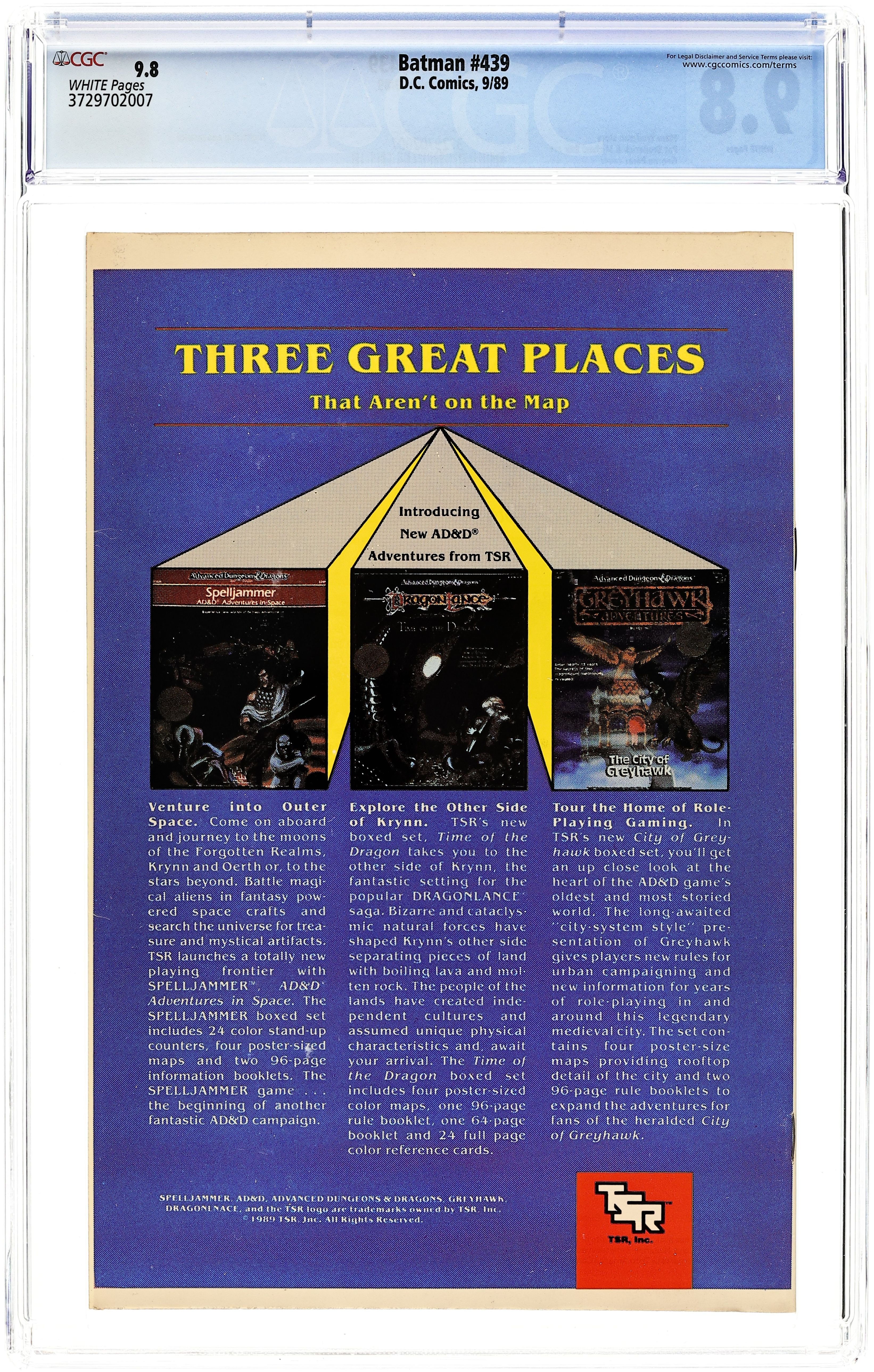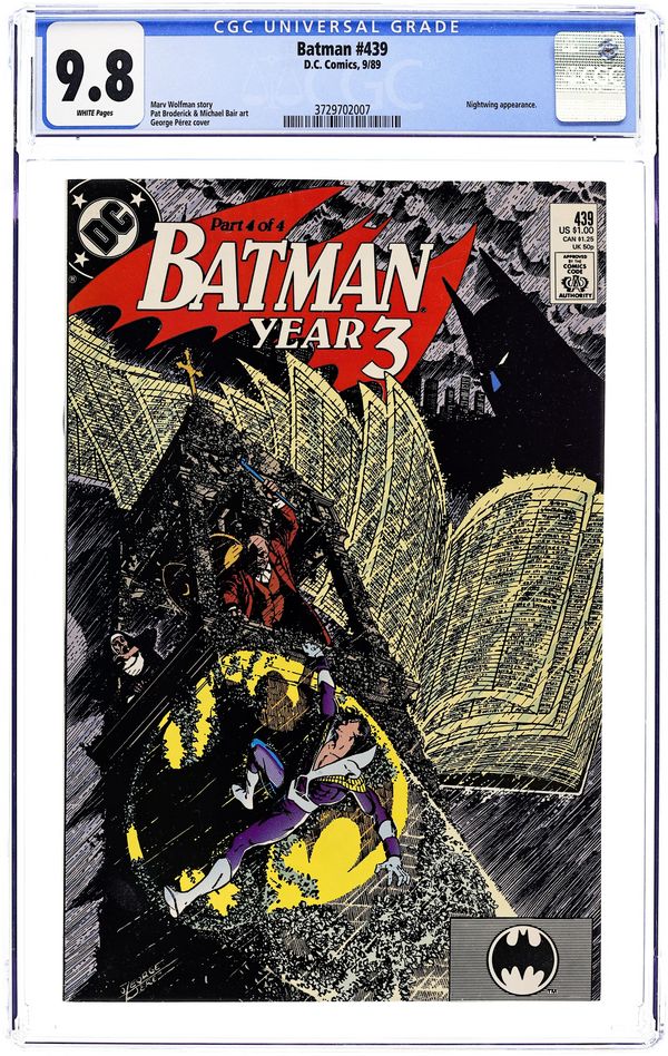 Cover art by George Perez. "Batman Year 3 (Part 4 of 4): Resolutions," script by Marv Wolfman, pencils by Pat Broderick, inks by Michael Bair; Boss Zucco gets killed, and suddenly the criminals of Gotham are falling over one another to get hold of a book he kept uncovering their secrets; Batman and Nightwing trace the book to a hiding place in the orphanage where Zucco and Dick Grayson spent part of their childhoods; The relationship between Batman and Nightwing starts to heal; The Post-Crisis origin of Robin (Dick Grayson) in flashback. 36 Pages, Full Color. Cover price $1.00. Grade: CGC 9.8 explanation of grade Condition: Used (collectible)
