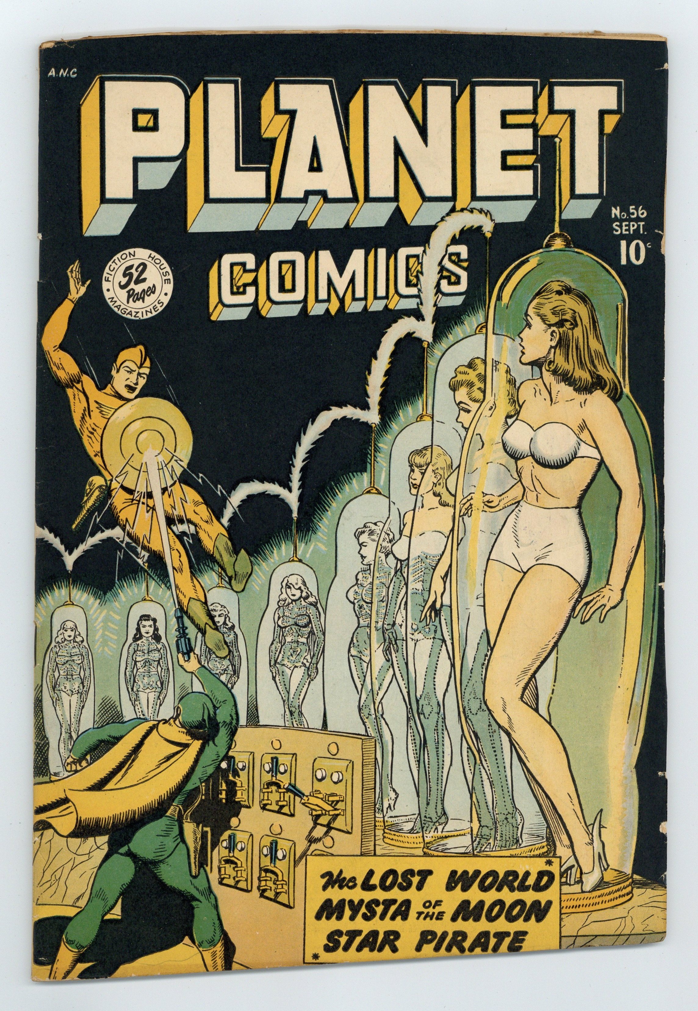 Cover by Joe Doolin. Edited by J. F. Byrne. Stories and art by George Evans, Enrico Bagnoli, Joe Doolin, Frank Doyle, Maurice Whitman, Murphy Anderson and Matt Baker. The first true science fiction comic, Planet Comics featured classic space opera with square-jawed heroes, rockets, rayguns and bug-eyed aliens of every stripe. In the Lost World, Hunt and Lyssa find an ancient Martian weapon and a warning of the Volta invasion; The body of a strange humanoid warns Mysta of an impending alien attack, in a story by good-girl art legend Matt Baker; Pirate queen Yrina manages to switch places with Futura on her way to trial, in a story with exquisite art by Enrico Bagnoli. Bizarre transparent-women-under-glass cover by Joe Doolin (also featuring The Red Comet, long after his last appearance in the comic). The Lost World; Futura; Mysta of the Moon; Auro Lord of Jupiter; The Unguarded Pass; Life On Other Worlds: Neptune; Space Rangers; The Star Pirate. 52 pages, Full Color. Cover price $0.10. Grade: VG 4.0 explanation of grade Condition: Used (collectible)
