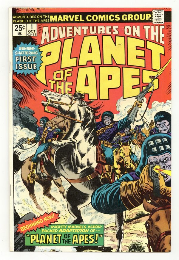 Starts Feb 23 Planet of the Apes 6-part movie adaptation begins. Reprints Planet of the Apes magazine in color. Cover pencils by Rich Buckler (?), inks by Joe Sinnott; NASA astronauts George Taylor, Dodge, Landon and Stewart lock themselves into suspended animation for a long-term voyage through deep space; The purpose of their mission is to test the Hasslein theory of the effects on a vehicle traveling at the speed of light; During the journey, the ship is pulled into a planet's gravitational field and it crash lands into a lake; They paddle to shore as their space capsule sinks; They have no idea what planet they are on; They find a colony of mute, savage human primitives and an attractive dark-haired woman that immediately catches Taylor's eye; Suddenly, a pack of horseback riding, rifle-bearing gorillas storm through the brush and begin hunting the savages; Taylor and the others have no choice but to flee along with the others. 36 pgs., full color. Cover price $0.25. Grade: VF- 7.5 explanation of grade Condition: Used (collectible)