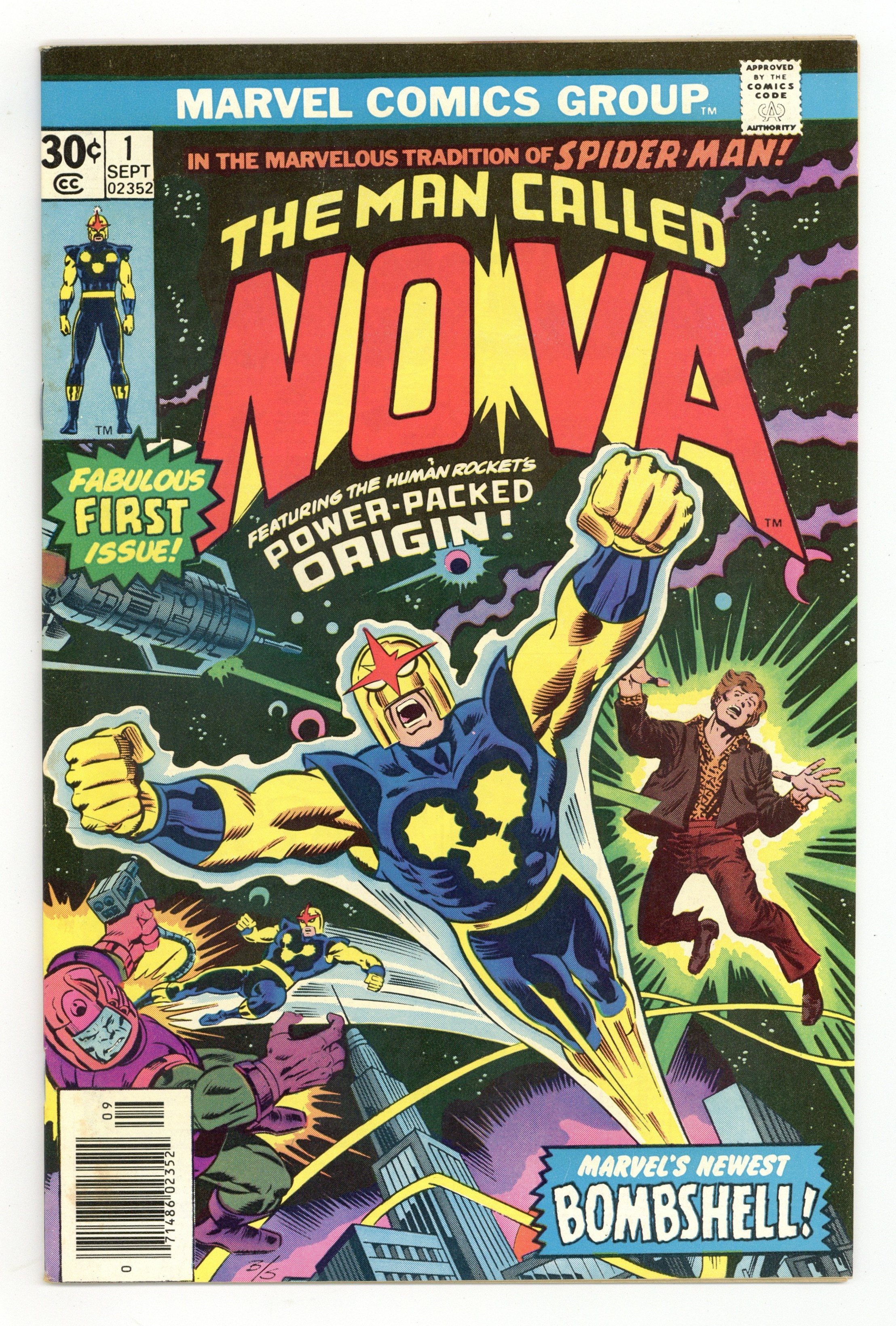 Starts Mar 9 Written by Marv Wolfman. Pencils by John Buscema. Inks Joe Sinnott. When a dying alien passes on his super-powers to Earth teenager Richard Rider, Rider becomes the man called Nova, the human rocket! In the marvelous tradition of Spider-man, Nova must now stop the murderous alien known as Zorr, or Earth is doomed! Note: First appearance of Nova. 36 pages, full color. Cover price $0.30. Grade: FN- 5.5 explanation of grade Condition: Used (collectible)