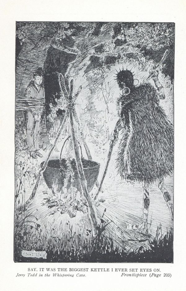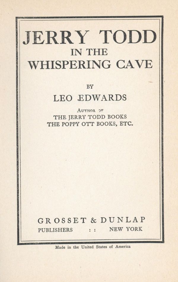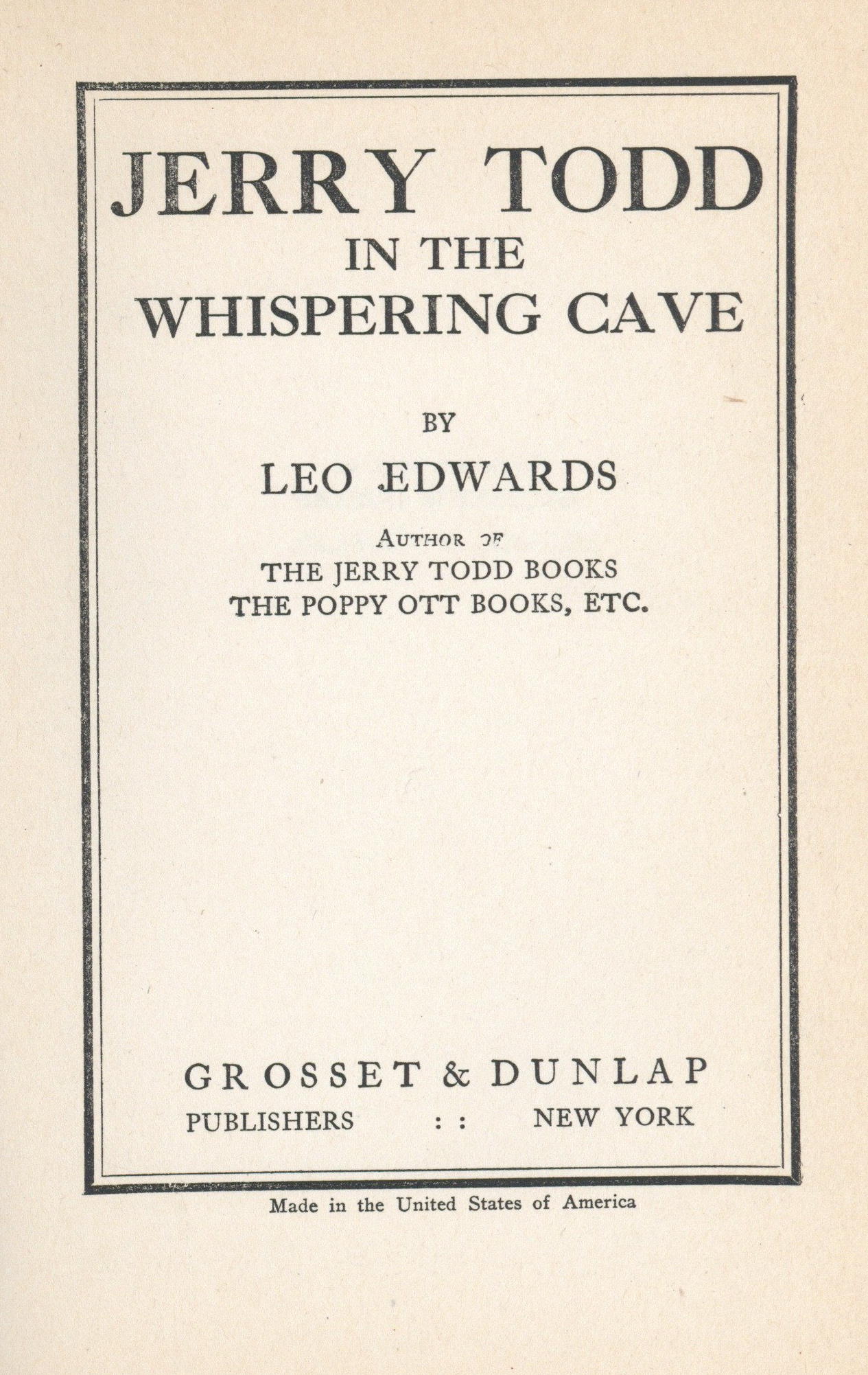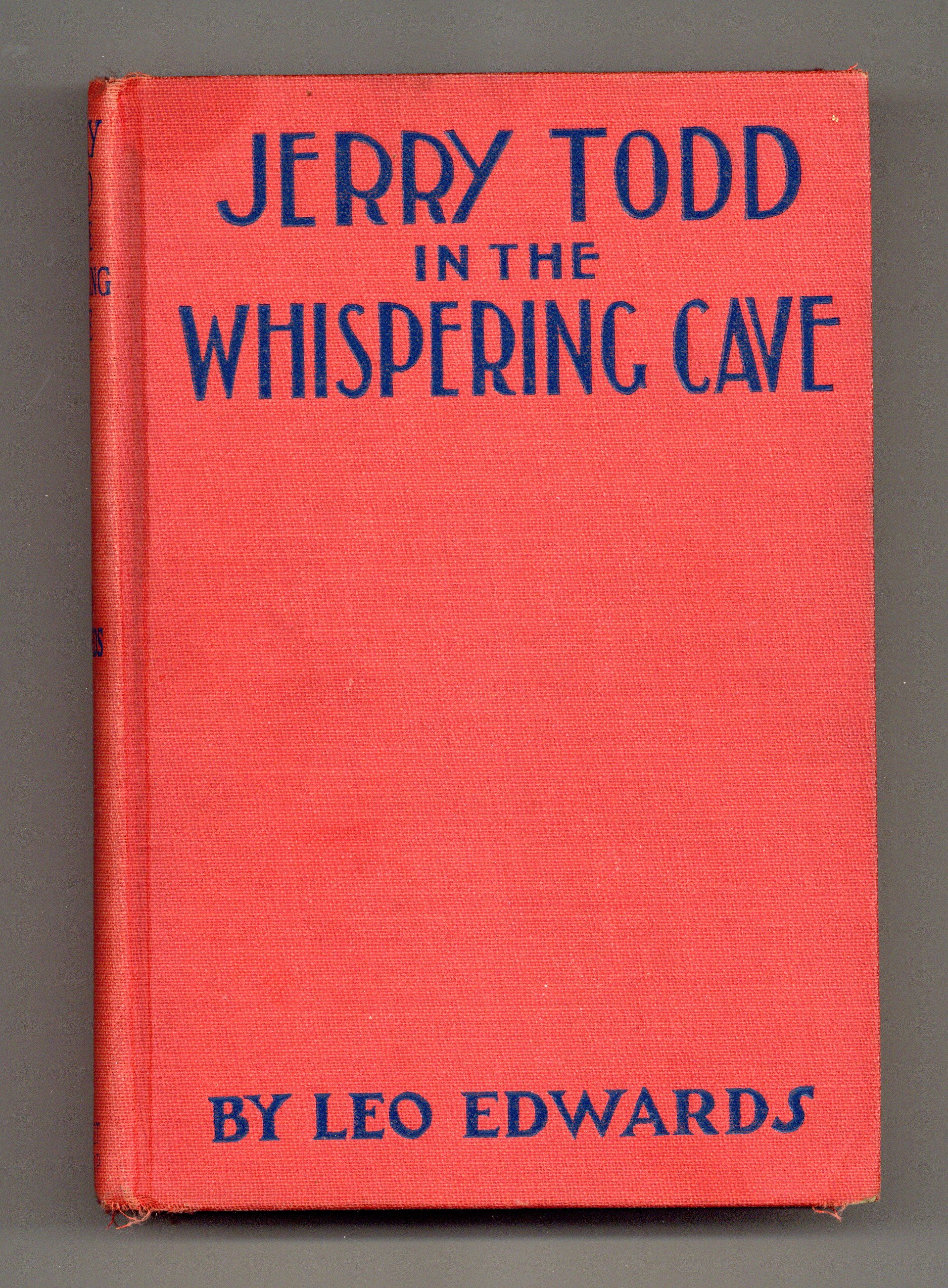 Jerry Todd In the Whispering Cave HC (1927 Grosset and Dunlap). Written by Leo Edwards. Hardcover lacking dust jacket. Slight spine lean. Minor rubbing to cloth extremities with some corners showing. Scattered soiling to binding. 5.5" x 7.5", 237 pages, text.