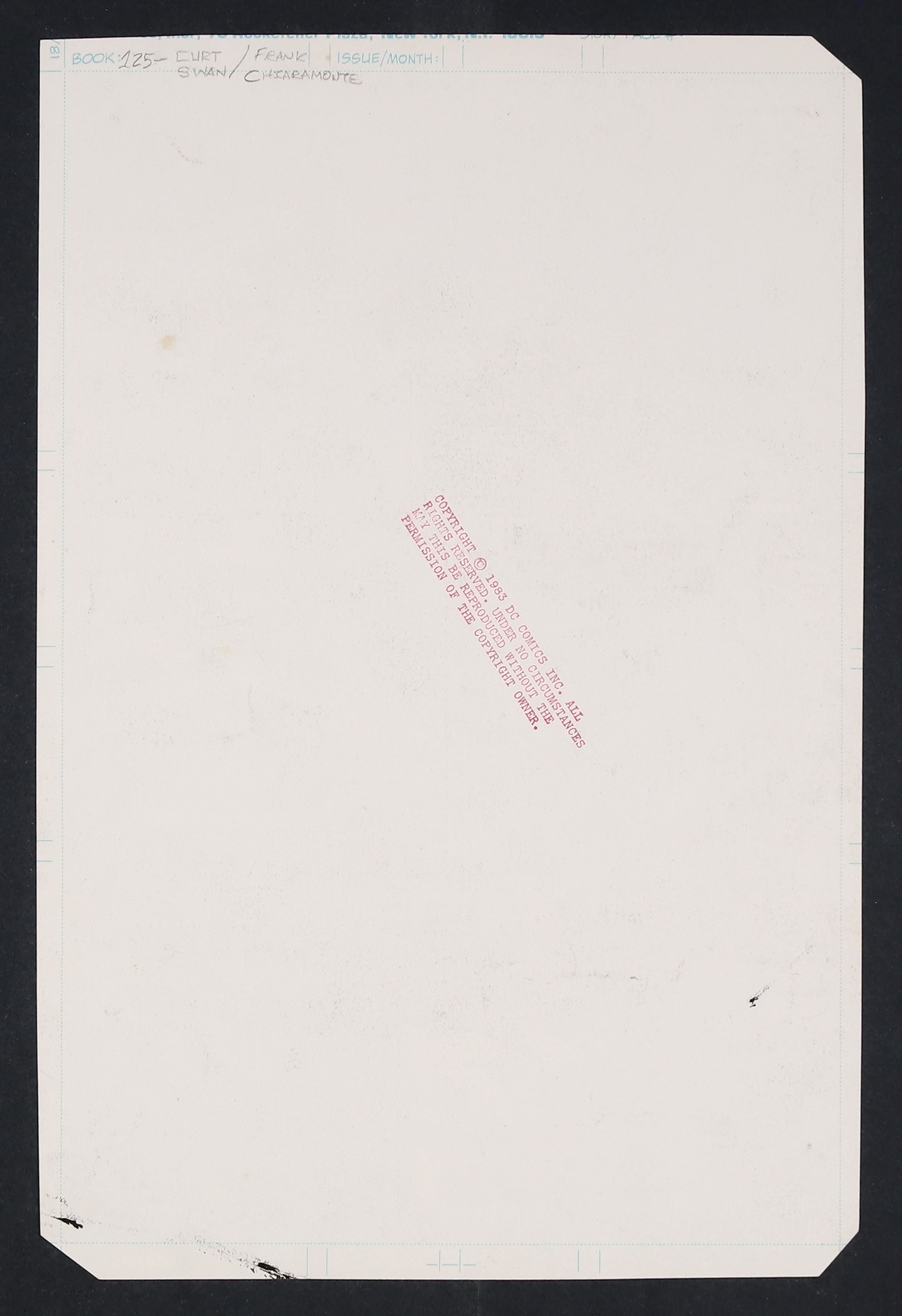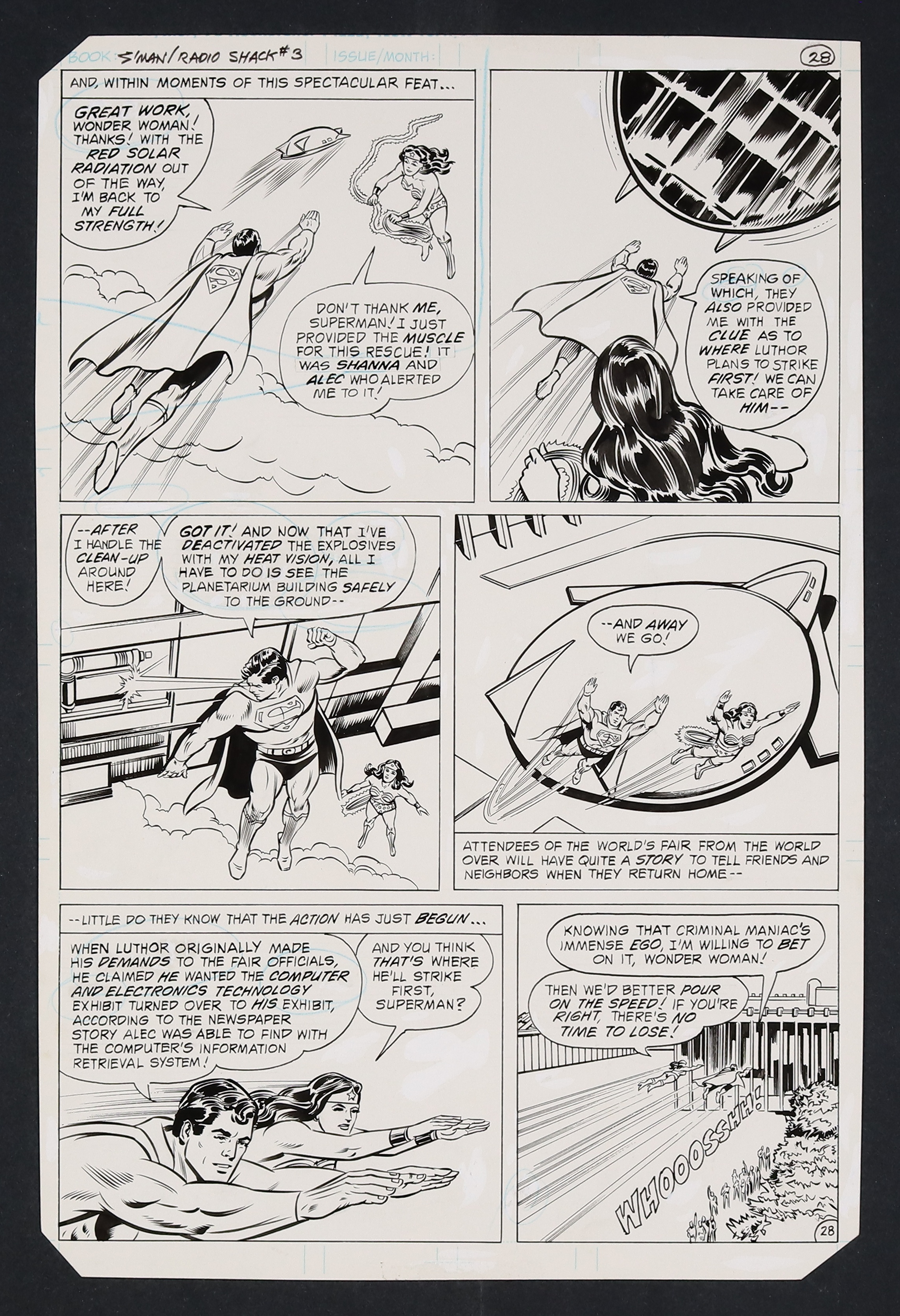 The World's Fair has come to Metropolis and of course, trouble abounds! Lex Luthor, furious about being rejected from the fair, traps Superman in the planetarium which he's rigged up with red sun generators to trap the Man of Steel. Thankfully Superman is able to contact Wonder Woman for help (through the Computer Whiz Kids!) who arrives to just pick up the entire building with her lasso! A great page from legendary Superman artist Swan and his regular inker at the time Chiaramonte. Pencil and ink on comic art board. 10 1/2" x 16".