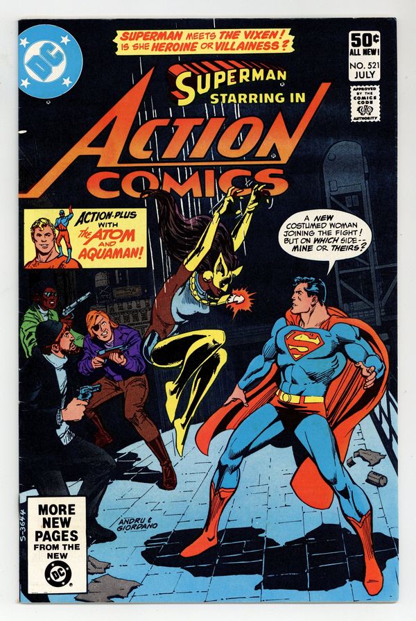 Starts Mar 9 Direct Edition. Cover pencils by Ross Andru, inks by Dick Giordano. "The Deadly Rampage of the Lady Fox," script by Gerry Conway, pencils by Curt Swan, inks by Frank Chiaramonte; In New York City, the Vixen steals a van full of furs that belong to entrepreneur Mordecai Mule; Superman, attending a function at Madison Square Garden, learns of the robbery and gives chase; Superman and Vixen team up to stop a horde of elephants. "Grow, Little Growfish!", script by Bob Rozakis, pencils by Alex Saviuk, inks by Vince Colletta; Off the coast of Virginia, Aquaman experiments with his telepathic powers by sending out a routine mental scanning wave; He discovers a large, gelatinous organism that shrinks in size; Aquaman contacts the Atom, who teleports over to investigate. 36 Pages, Full Color, $0.50. Cover price $0.50. Grade: FN 6.0 explanation of grade Condition: Used (collectible)