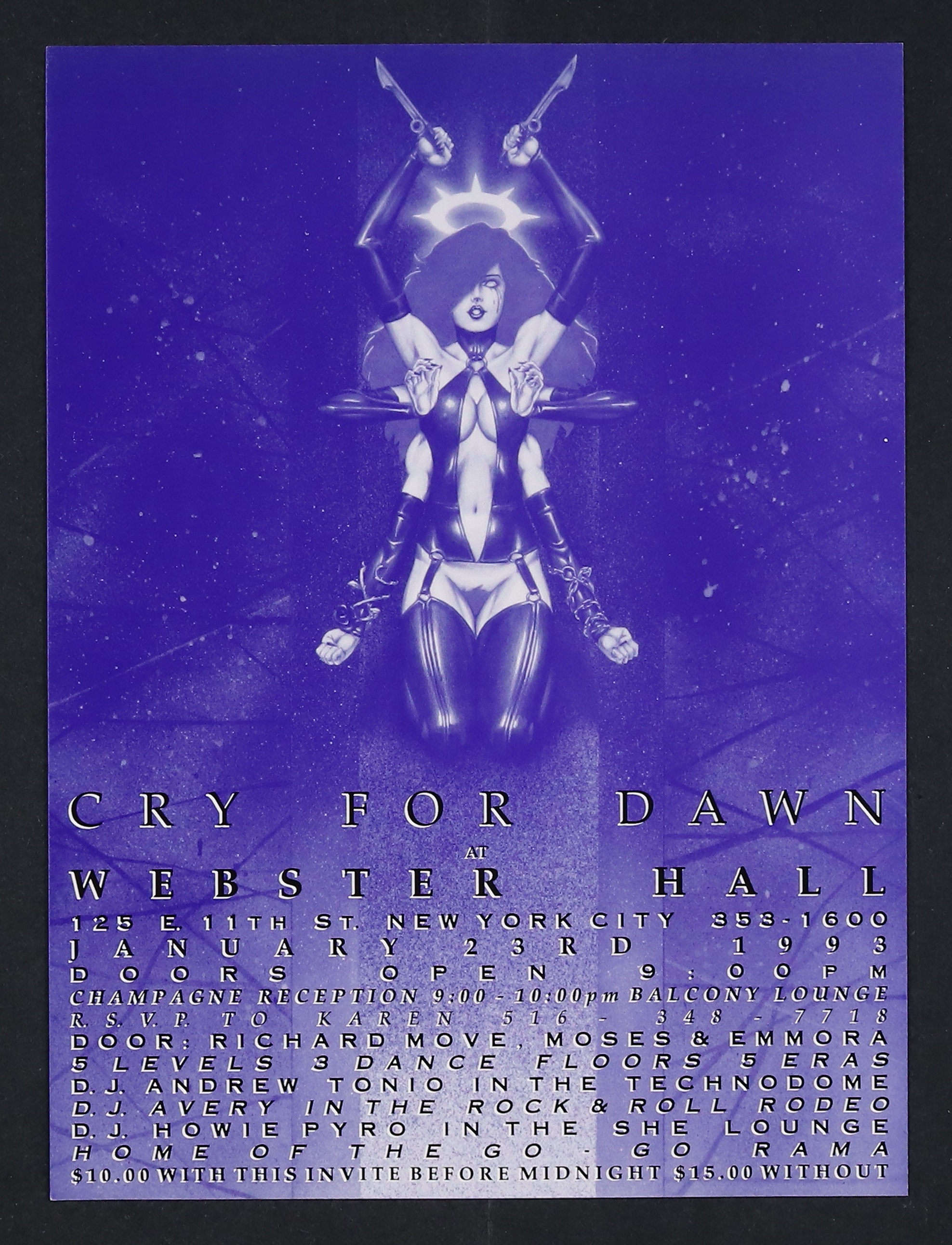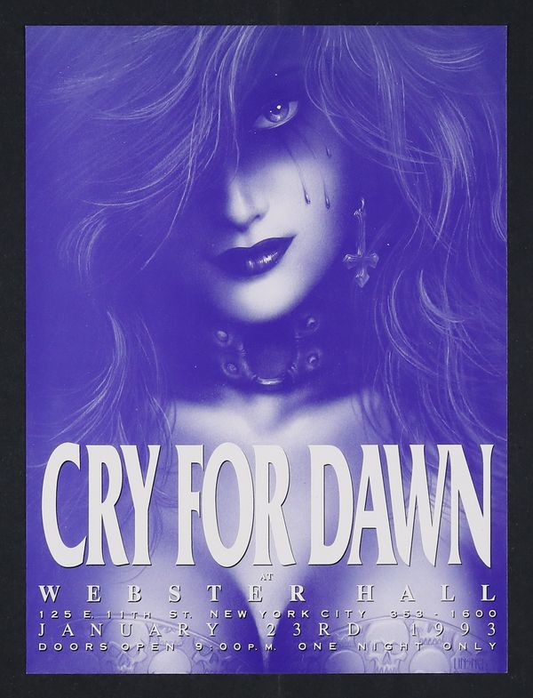 Cry For Dawn at Webster Hall Flyer/InvitationPublished 1993- Promoting the series premiere event that took place on January 23, 1993. High quality print on glossy stock. 9" x 12".