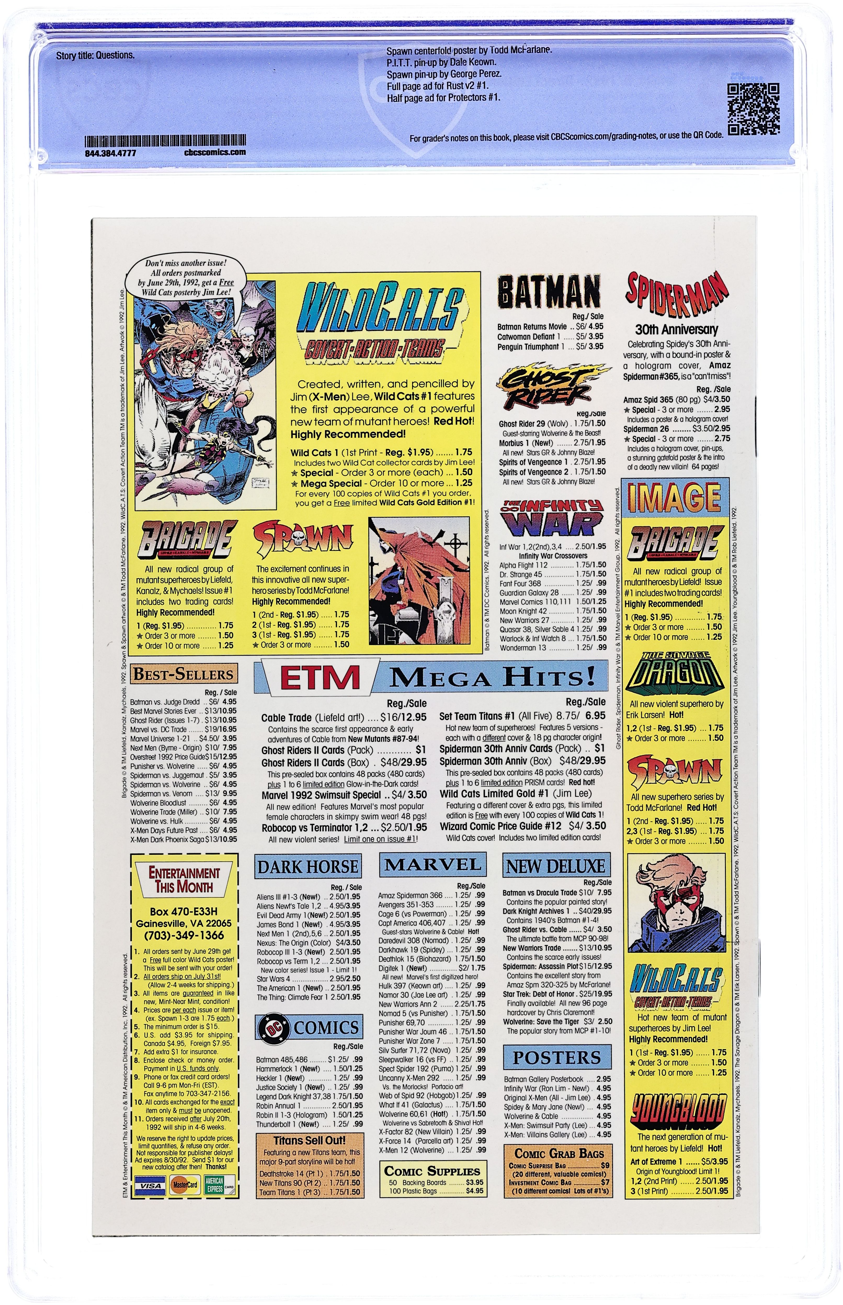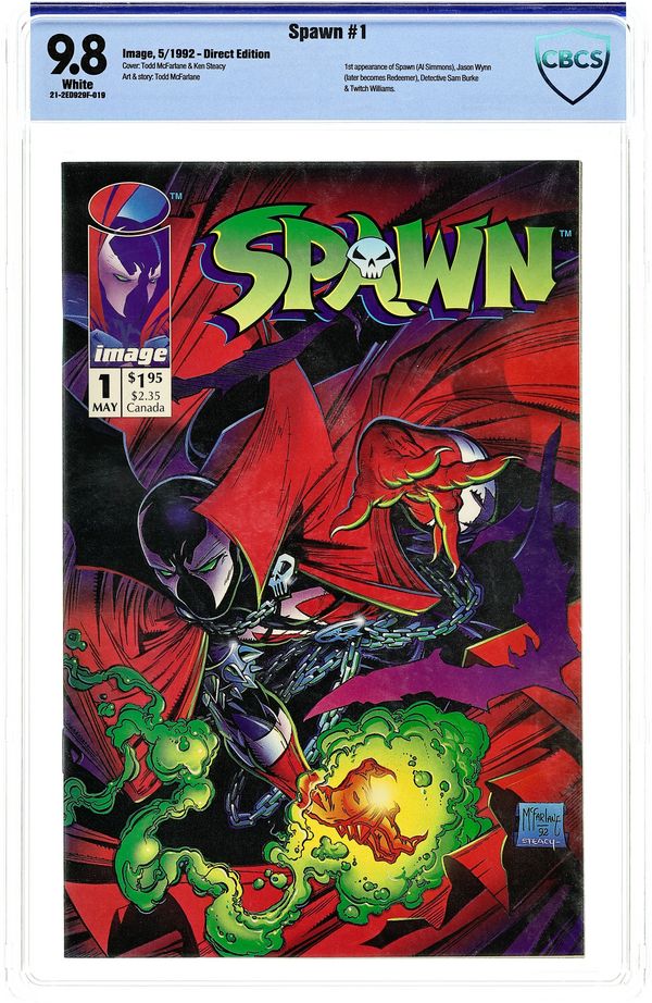 Direct edition. "Questions!" Part 1 of 4. Created, story, and art by Todd McFarlane. When government assassin Al Simmons is murdered, a deal with the devil brings him back to the realm of the living. But now he walks the shadows as the disfigured soldier of hell known as Spawn. Armed with unimaginable, but finite, magical abilities, Spawn is destined to play an important role in the upcoming Armageddon. But, what happens when this rebellious anti-hero decides he won't fight for either side? Superstar artist and Image co-founder, Todd McFarlane, creates a character who has gone on to inspire a major motion picture, an HBO animated series, numerous spin-off comic series, and one of the most successful toylines of all time. Spawn centerfold by Todd McFarlane & Ken Steacy. Pin-up of Spawn by George Perez. Pin-up of PITT by Dale Keown. Cover by McFarlane & Steacy. 1st app of Sam and Twitch Cover price $1.95. Grade: CBCS 9.8 explanation of grade Condition: Used (collectible)