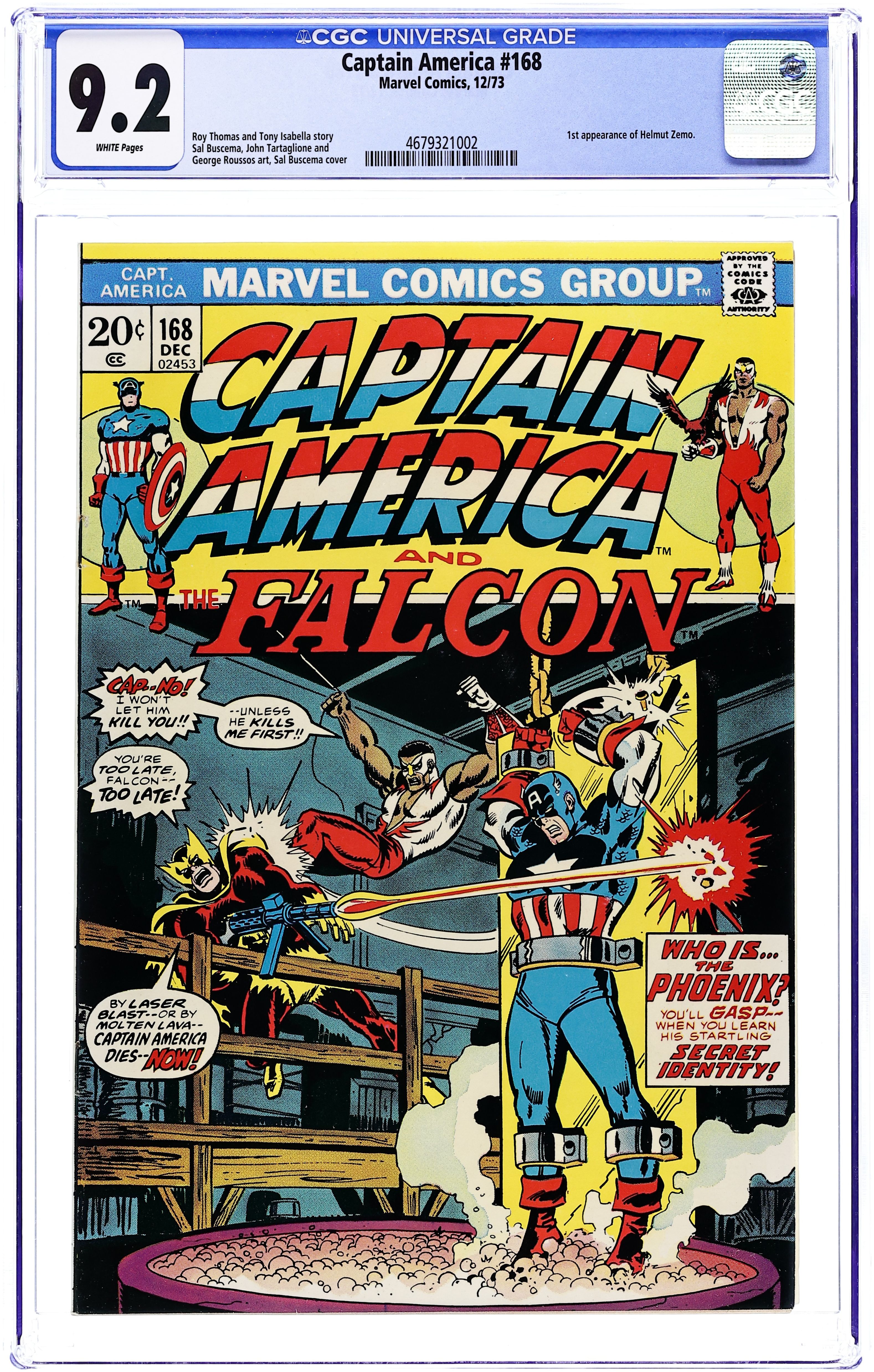 First appearance of Helmut Zemo in "And a Phoenix Shall Arise!" Script by Roy Thomas and Tony Isabella. Pencils by Sal Buscema. Inks by John Tartaglione and George Roussos. Cover by Sal Buscema and John Verpoorten. On a rooftop in Manhattan, a mysterious assailant ambushes the star-spangled avenger! Cap doesn't know who the surprise attacker is, but he calls himself the Phoenix. And he really seems to hate Captain America! The fight is short and inconclusive, so the next evening Cap patrols the same area...and runs into the Phoenix again! However this time the new villain wins! And as shown on the cover, the Living Legend soon finds himself dangling over a vat of Adhesive X. Hold on, Adhesive X was the calling card of the late Baron Heinrich Zemo. Is the past coming back to haunt the Sentinel of Liberty? Thankfully, the Falcon and Redwing make sure it's not today. But one of Cap's greatest foes -- and also one of the Avengers' -- is born! Flashback cameos by Baron Heinrich Zemo and the Red Skull. (Note: Helmut Zemo returns several years later in Captain America 275 and officially adopts the name and uniform of his father.) 36 pages. Cover price $0.20. Grade: CGC 9.2 explanation of grade Condition: Used (collectible)