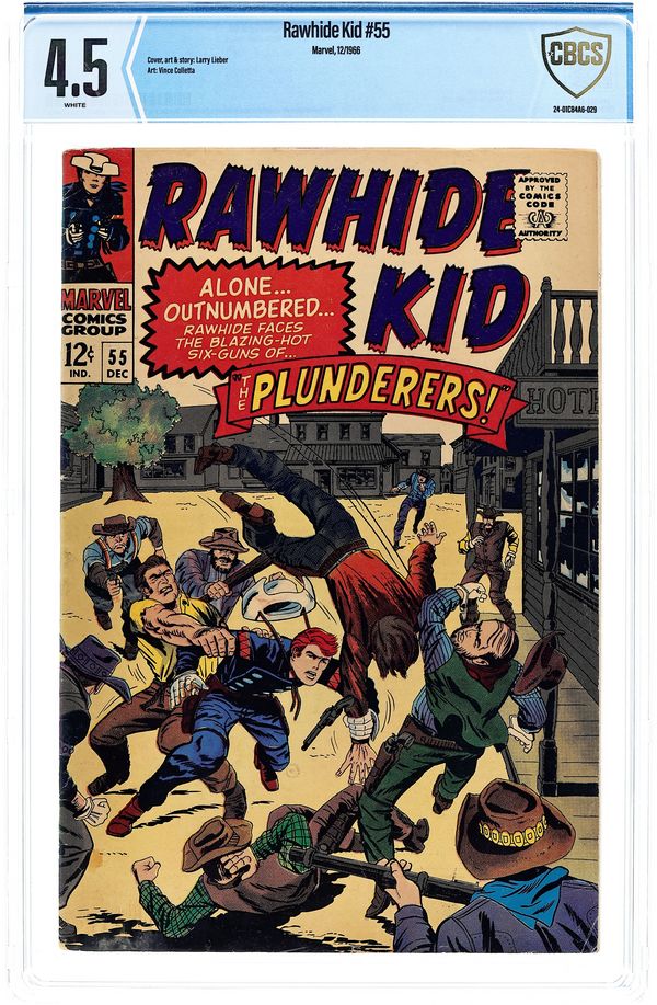 Starts Mar 2 Cover by Larry Lieber. Stories by Larry Lieber and Stan Lee. Art by Larry Lieber, Don Heck and Vince Colletta. Alone...outnumbered...the Rawhide Kid faces the blazing-hot six-guns of..."The Plunderers!" by Larry Lieber and Vince Colletta. Also in this issue: Les Cooper learns a lesson from his cousin Joe Cooper, who refuses to wear a gun, in the back-up story "With Gun in Hand!" by Stan Lee and Don Heck, reprinted from issue #17. 32 pages, full color. Cover price $0.12. Grade: CBCS 4.5 explanation of grade Condition: Used (collectible)