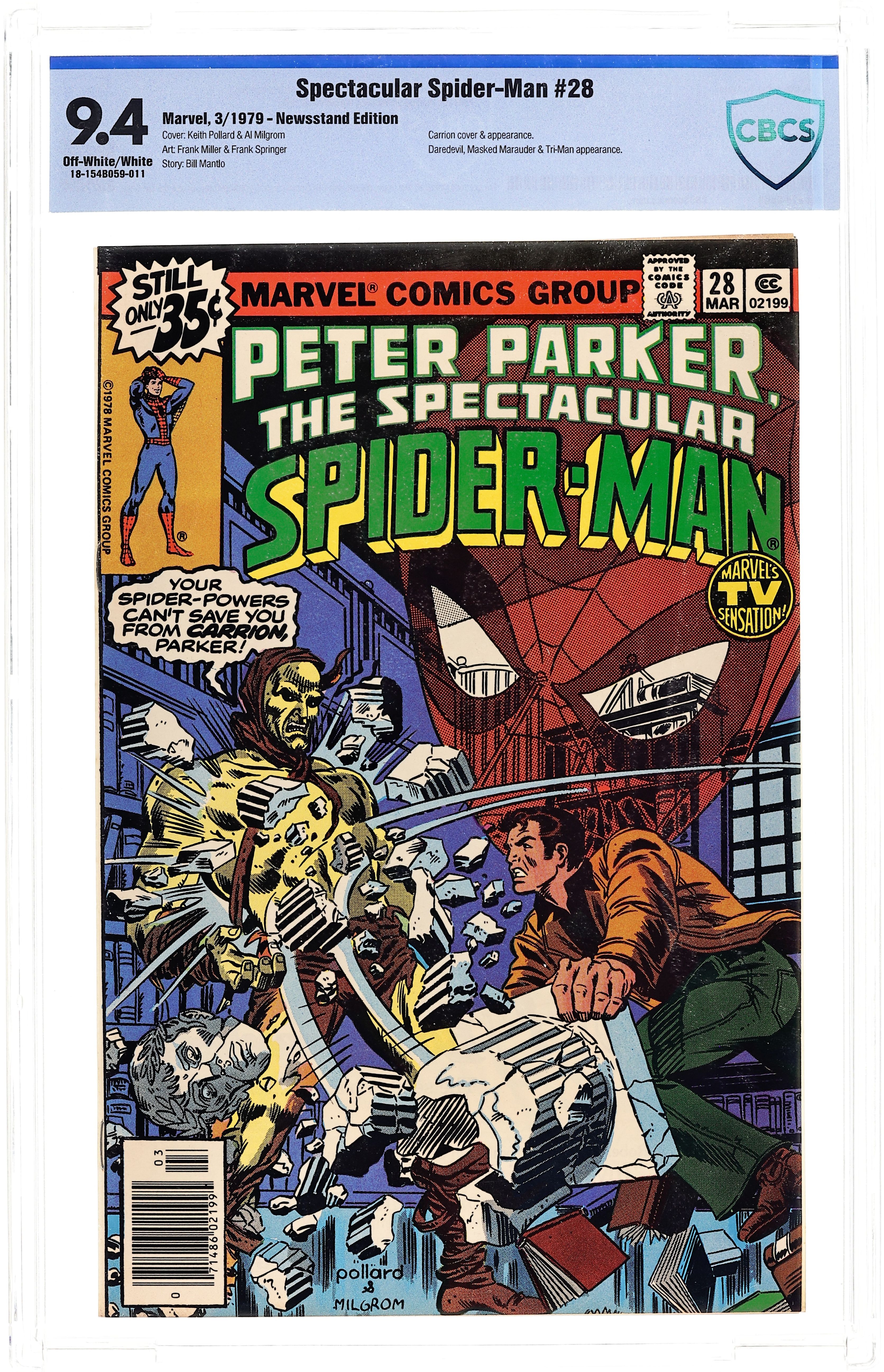 Starts Mar 2 "Ashes to Ashes!" Guest-starring Daredevil. Script by Bill Mantlo. Pencils by Frank Miller. Inks by Frank Springer. Cover by Keith Pollard and Al Milgrom. The situation is desperate indeed as the Masked Marauder's nuclear bombdroid is headed for the heart of New York City! Only one hero can stop the bomb...the Spectacular Spider-Man! But how is a blind wall-crawler going to do that? While Spidey tries to disarm the bombdroid, Daredevil battles the Masked Marauder one-on-one! Meanwhile, Carrion has trashed Peter Parker's apartment and is lying in wait for Peter at the Empire State University campus library! Cameo appearances by Mary Jane Watson and Hector Ayala. (Note: This issue was reprinted in 1984 in Spider-Man and Daredevil 1, and again in 1994 in The Complete Frank Miller Spider-Man,) 32 pages Cover price $0.35. Grade: CBCS 9.4 explanation of grade Condition: Used (collectible)