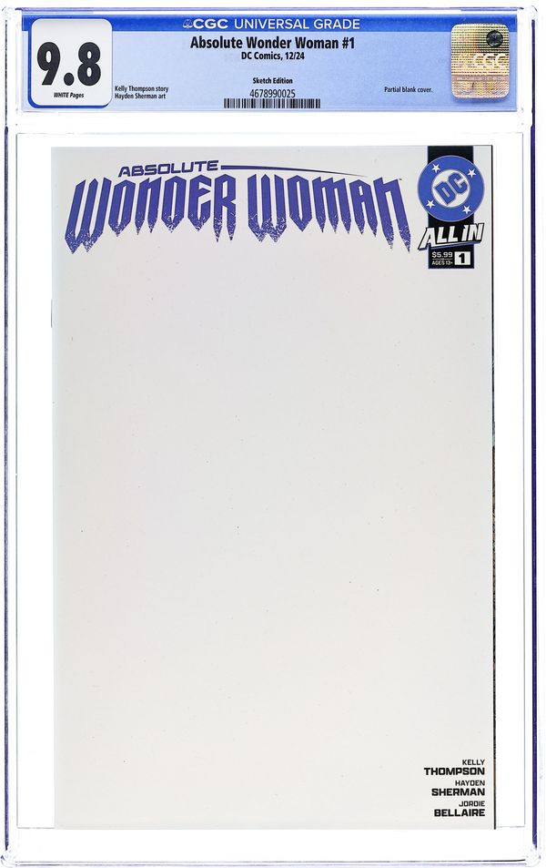 Starts Mar 2 Written by Kelly Thompson. Art by Hayden Sherman. Blank Sketch Cover. EISNER WINNER KELLY THOMPSON AND BREAKOUT ARTIST HAYDEN SHERMAN REINVENT WONDER WOMAN FROM THE GROUND UP! Without the island paradise...without the sisterhood that shaped her...without a mission of peace...what's left is the Absolute Amazon! 40 pages, full color. Rated T+ Cover price $4.99. Grade: CGC 9.8 explanation of grade Condition: Used (collectible)