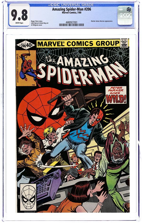 Direct Edition. "A Method in His Madness!" Script by Roger Stern. Art by John Byrne (breakdowns) and Gene Day (finishes). Cover by Al Milgrom. For the past few weeks, the devious Dr. Jonas Harrow has tormented J. Jonah Jameson with his Mental Attitude Response Variator (MARV) ray! And after forcing the Daily Bugle's publisher to have a nervous breakdown, the twisted doctor turns his attention to the city editor: Joe Robertson! While blasting Robbie (from afar) with the MARV ray, Dr. Harrow decides to radiate the entire Bugle city room! But the mad scientist is not aware that Spider-Man's alter-ego has stopped by for a visit! One thing leads to another...and the web-slinger, Jonah, and Jonas rendezvous for a meeting of the minds! May the craziest man win! (Note: This is one of only three issues John Byrne penciled for the Amazing Spider-Man title (1st series): issues 189, 190, and 206.) 36 pgs. Cover price $0.40. Grade: CGC 9.8 explanation of grade Condition: Used (collectible)