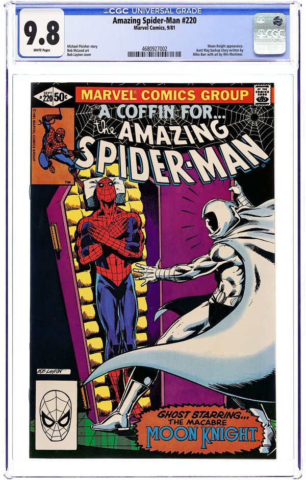 Direct Edition. "A Coffin for Spider-Man!" Guest-starring Moon Knight. Script by Michael Fleisher. Art by Bob McLeod. Cover by Bob Layton. A crime wave is sweeping across New York City! And the leader of the outbreak is Moon Knight! Hold on, isn't the knight one of the heroes in this town? That's what the web-slinger thought! At the Metropolitan Museum of Art, Spider-Man interrupts Moon Knight's next heist! But then he helps his lunar adversary escape! Is the wall-crawler joining or stopping the (crime) wave? Cameo appearances by J. Jonah Jameson and Frenchie. Second story: "The Nursing Home Caper" Script by Mike W. Barr. Art by Win Mortimer. With quick thinking Aunt May stops a robbery at her nursing home. Cameo appearances by Anna Watson and Spider-Man. (Note: The web-slinger and Moon Knight previously met in Spectacular Spider-Man 22 & 23 and Marvel Team-Up Annual 4.) 36 pages. 50 cent cover price. Cover price $0.50. Grade: CGC 9.8 explanation of grade Condition: Used (collectible)