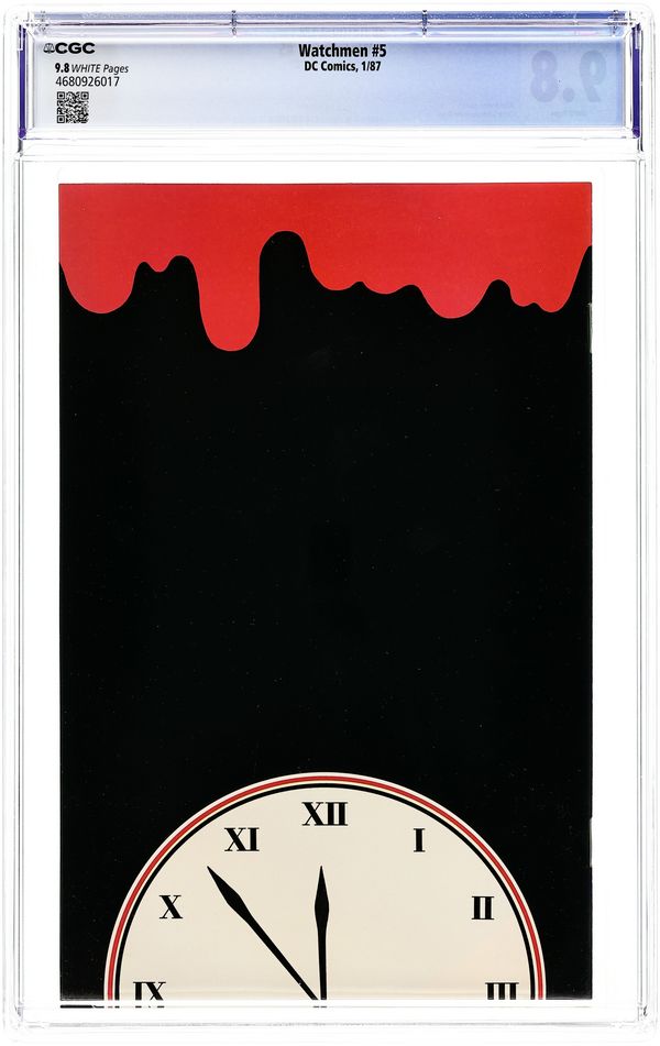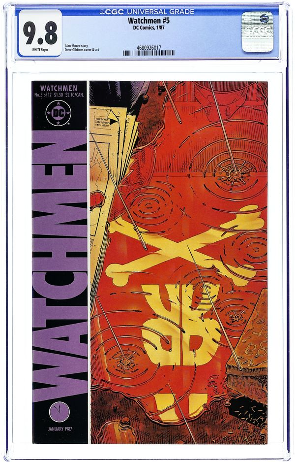 "Fearful symmetry". Part 5 of 12. Story by Alan Moore. Art and cover by Dave Gibbons. As Rorschach continues to hunt for the mask killer, an attempt is make on Adrian Veidt's life. Meanwhile, Laurie and Dan become closer. Includes four page fictional text feature presenting Chapter 5 of the book, "Treasure Island treasury of comics". 32 pages. Full color. No ads. Cover price $1.50. Grade: CGC 9.8 explanation of grade Condition: Used (collectible)
