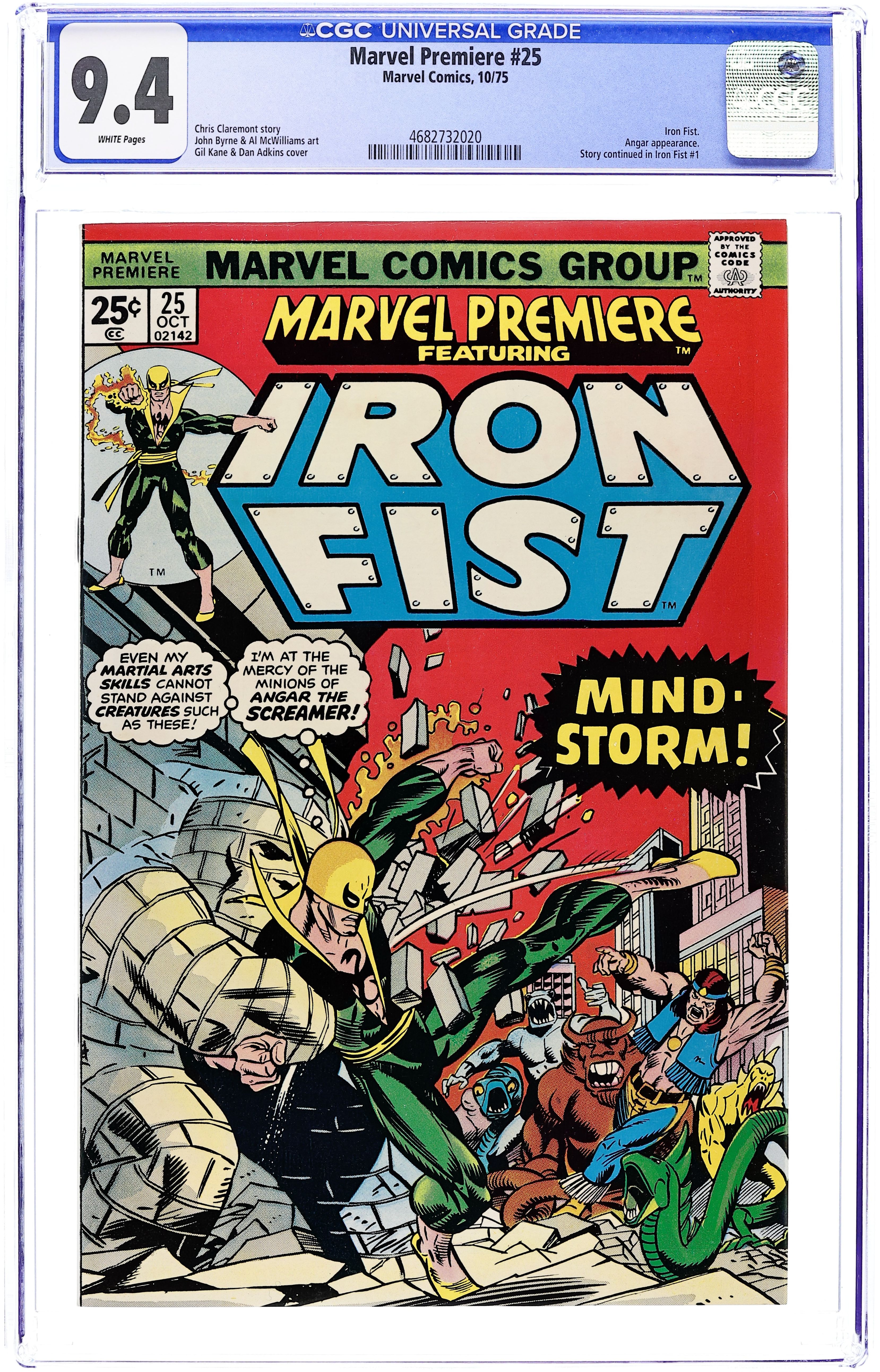Starts Later today Cover pencils by Gil Kane, inks by Dan Adkins. Morning of the Mindstorm!, script by Chris Claremont, pencils by John Byrne, inks by Al McWilliams; Iron Fist arrives at the Wings to discover Colleen missing and Lee raving like a mad man; Danny and Scarfe try to track down Colleen but are assaulted by illusions courtesy of Angar; Beating Angar down, Iron Fist discovers a Stark International i.d. card on the villain and figures the company is behind the disappearance of his friend. Continued in Iron Fist (Marvel, 1975 series) #1. The letters page contains Marvel Value Stamp series A # 6 (Thor by John Buscema). 36 pgs. $0.25. Cover price $0.25. Grade: CGC 9.4 explanation of grade Condition: Used (collectible)
