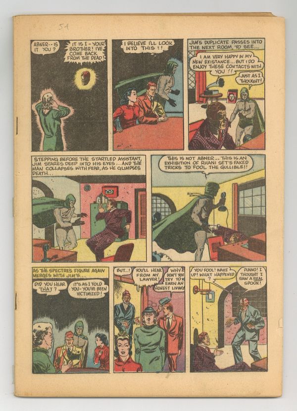Starts Apr 4 Cover by Bernard Baily. "The Spiritualist," script by Jerry Siegel, art by Bernard Baily; Clarice's mother is being victimized by a phony Rhani, so Jim investigates and before the Spectre can stop the Rhani from killing Clarice; He is called before the mysterious voice to choose continued life on Earth or eternal rest. "Into the Pit," script by Albert Sulman, art by Joe Sulman; Biff Bronson concludes his battle against the Wizard and his mechanical robots. "Trouble with a Capital T," starring Captain Desmo, art by Ed Winiarski. "The Noisy Party," script by Jerry Siegel, art by Chad Grothkopf; Radio Squad vs. The Cloak. "The Traitor," starring Lt. Bob Neal, script by Robert Hirsch, art by Russ Lehman. "Africa," starring King Carter, art by Paul Lauretta. "The Policy Murders, starring Detective Sergeant Carey," script and art by Joe Donohoe. Untitled "Sergeant O'Malley of the Red Coat Patrol" story, art by John Lehti. "Gem Caper," starring Bulldog Martin, art by Bart Tumey. 68 pgs., full color. $0.10. Cover price $0.10. Grade: Coverless explanation of grade Condition: Used (collectible)
