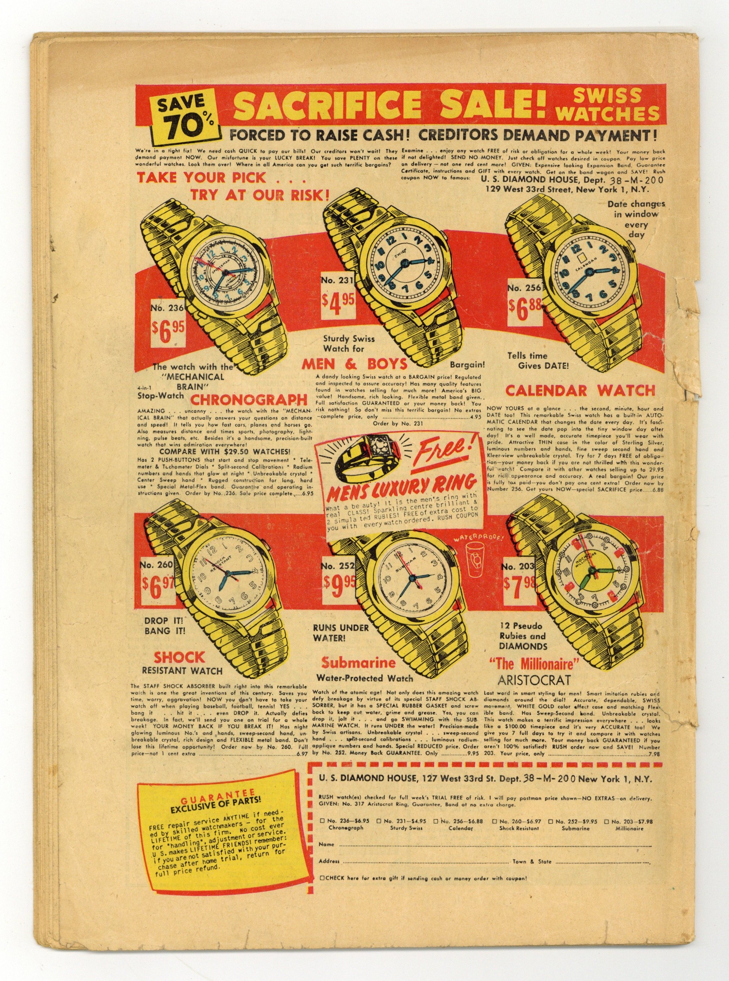 Starts Apr 4 Cover art by Wally Wood. Dead Right!, script by Albert B. Feldstein, art by Jack Kamen; A fortune teller predicts to a woman that a man who wants to marry her, but she finds repulsive, is going to inherit twenty-five thousand dollars and die shortly afterward, so she marries him. Under Cover!, script by Albert B. Feldstein, art by Wally Wood; When Sam Masters sees a secret society whip a girl to death he tries to contact the F.B.I. before they can catch him. The Bend! text story by Albert B. Feldstein, art by Marie Severin. Not So Tough!, script by Albert B. Feldstein, art by Joe Orlando; A space commander who is as tough as nails on his crew is reduced to soft putty in the grip of a large gravitational force. Sugar 'N Spice 'N..., script by Albert B. Feldstein, art by Graham Ingels (as Ghastly); A brother and sister lose their ball in the yard of an old woman whom they referred to as "The Old Crab"; She eventually gave them the ball back, but warned them to stay away. 36 pgs. $0.10. NOTE: This issue was reprinted by East Coast Comics with a $1 cover a 1970's copyright date (see E.C. Classic Reprints #8). These and other changes make the reprint easy to distinguish from the original which has a 10-cent cover price and a 1950's publication date. Cover price $0.10. Grade: FR/GD 1.5 explanation of grade Condition: Used (collectible)