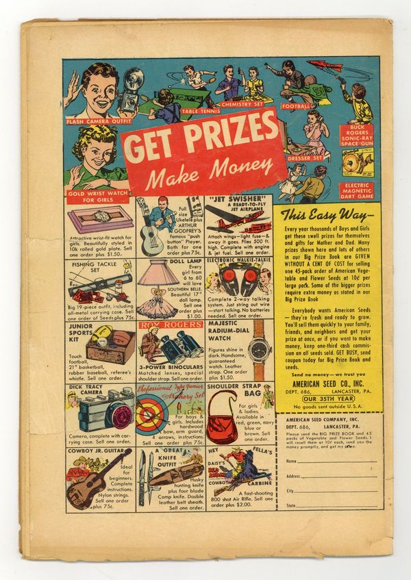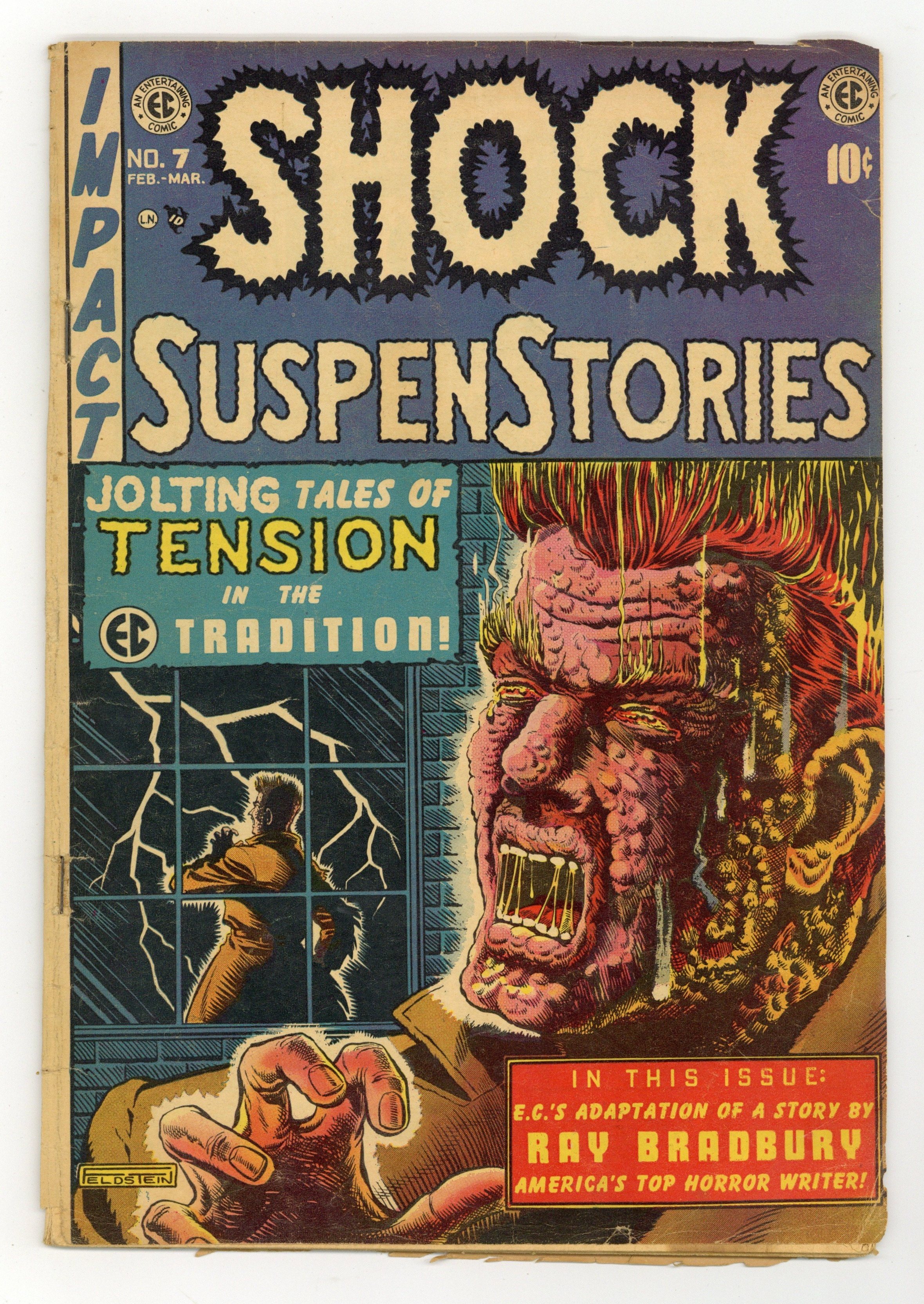 Starts Apr 4 Cover art by Albert B. Feldstein. Beauty And The Beach!, script by Albert B. Feldstein, art by Jack Kamen; Two men are frustrated by the vanity of their attractive wives and the fact that they have offers to do some modeling and to participate in four beauty contests. The Bribe!, script by Albert B. Feldstein, art by Wally Wood; A fire inspector commits suicide when a fire breaks out in a night club where he took a bribe to overlook code violations; He thinks his daughter was killed in the fire with the other patrons because of a photo taken of her earlier that evening. The Mountain Jackal text story by Albert B. Feldstein. Infiltration, script by Albert B. Feldstein, art by Joe Orlando; This story postulates that a small government agency responsible for ferreting out Martian infiltrators is completely infested with Martian infiltrators except for a sole human whom they gun down. The Small Assassin!, script by Ray Bradbury and Albert B. Feldstein (adaptation), art by George Evans; a mother is paranoid that her newborn baby is attempting to kill her. 36 pgs. $0.10. Cover price $0.10. Grade: GD/VG 3.0 explanation of grade Condition: Used (collectible)