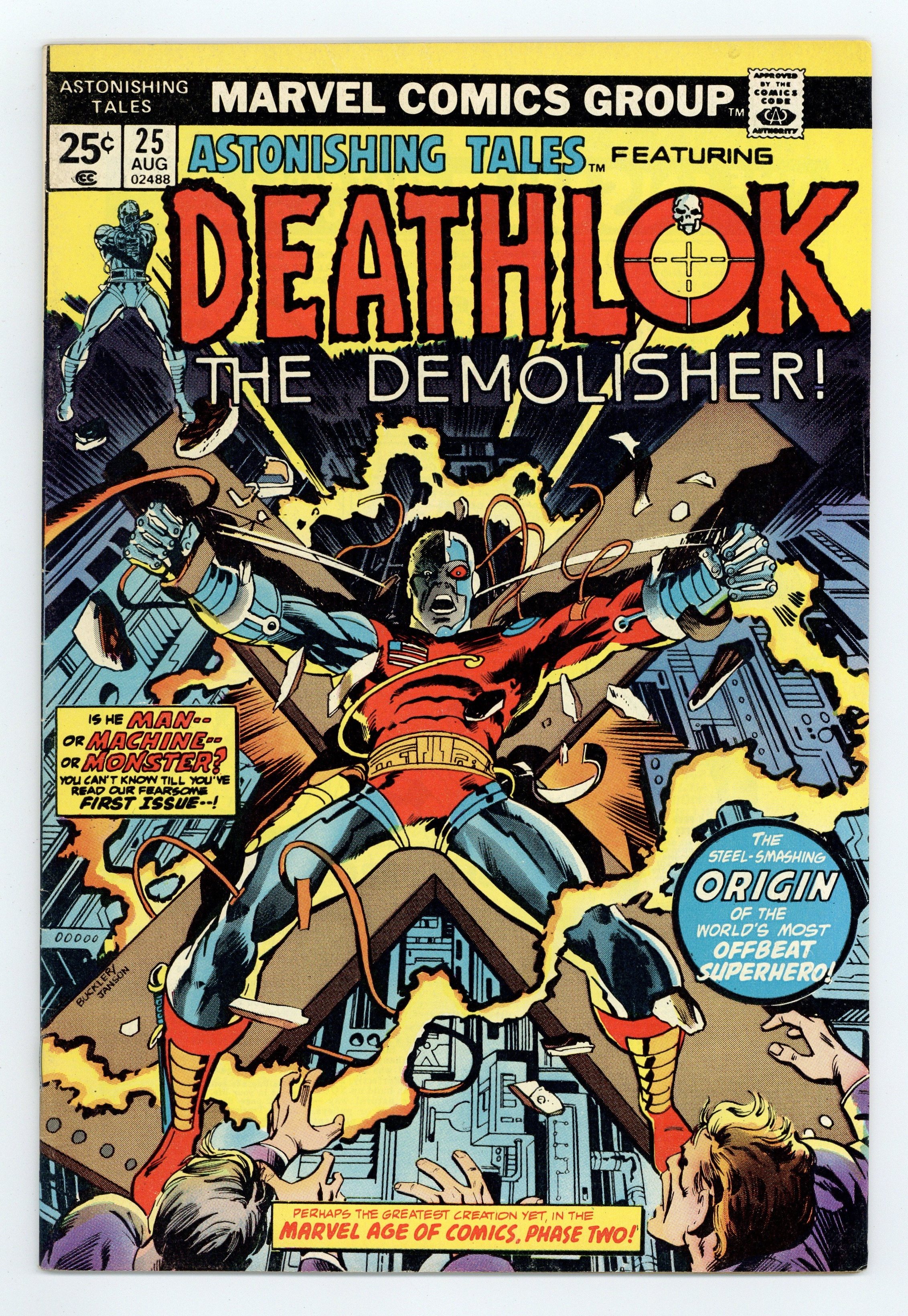 This issue not only marks George Perez's first pro comic art, but the first appearance of Deathlok! Cover pencils by Rich Buckler, inks by Klaus Janson. A Cold Knight's Frenzy, script by Rich Buckler (Plot; Concept) and Doug Moench (Script), pencils by Rich Buckler, inks by Rich Buckler (Primary Inks), Klaus Janson (Ink Assist), Al Milgrom (Ink Assist), and Mike Esposito (Ink Assist); Deathlok is shown to be a robot with a human mind that has the ability to override its programming; Deathlok has a flashback showing that his old army buddy Major Simon Riker is responsible for his creation. Stan Lee's Soapbox, art by Rich Buckler. Creation of Deathlok article, art by Rich Buckler. Promo for Giant-Size Spider-Man #1. Deathlok creation satire, script by Doug Moench, pencils by George Perez, inks by Mike Esposito; George Perez' first published work. Marvel Value Stamp #68 featuring Daimon Hellstrom [Son of Satan]. 36 pgs. $0.25. Cover price $0.25. Grade: VG+ 4.5 explanation of grade Condition: Used (collectible)