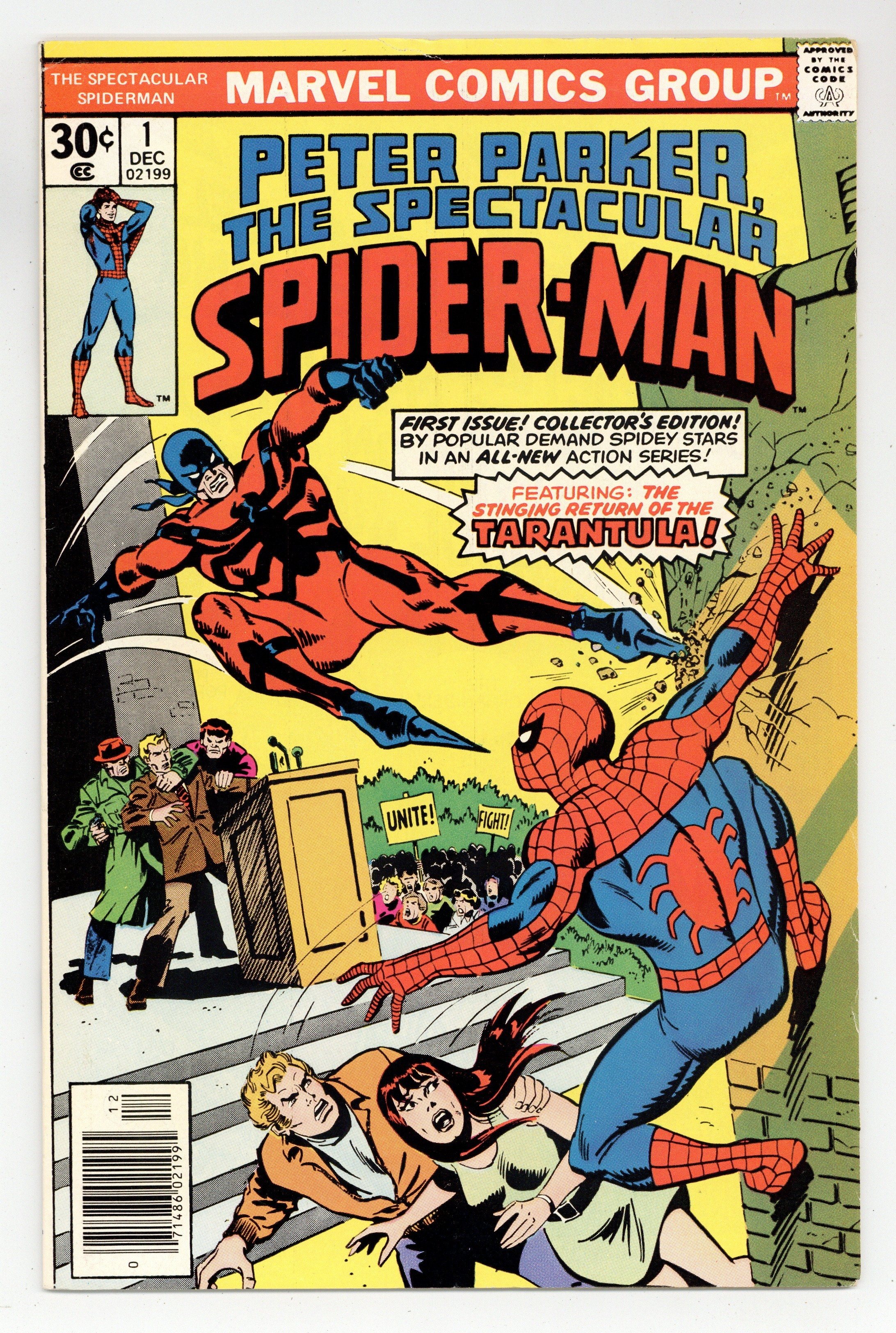 Starts Mar 9 "Twice Stings The Tarantula!" Part 1 of 3. Script by Gerry Conway. Pencils by Sal Buscema. Inks by Mike Esposito. Cover by Sal Buscema and John Romita. The first issue of a brand new series for Spider-Man! The story opens with a bang as the Tarantula kidnaps the Empire State University vice-chancellor, despite the best efforts of the web-slinger, Flash Thompson, and Mary Jane Watson! Next, the Tarantula tries to kill the mayor, but this time the Spectacular Spider-Man is ready! Can the wall-crawler beat the Tarantula and save Mayor Abe Beame? First appearance of Edward Lansky (aka Lightmaster). (Notes: The Spectacular Spider-Man series became the third monthly title for Spider-Man. The first issue of the series debuted the same month as Amazing Spider-Man 163 and Marvel Team-Up 52. The letters page contains an essay from Gerry Conway describing the plans for the new Spider-Man title.) 32 pages Cover price $0.30. Grade: VF- 7.5 explanation of grade Condition: Used (collectible)
