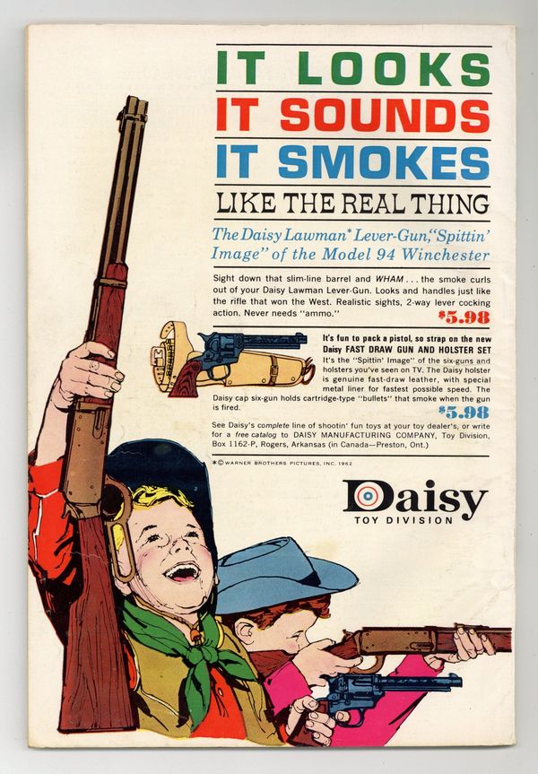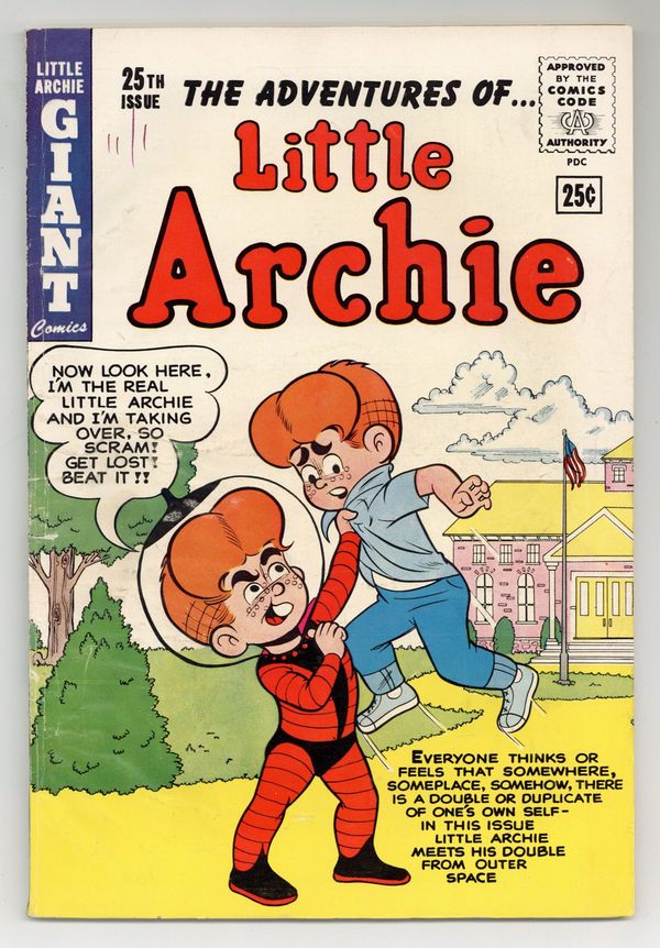Cover art by Bob Bolling. Uncle Burt Is Back, script and art by Bob Bolling; Mary's brother Burt, a sailor, comes to visit; Little Archie is fascinated by Burt's stories of seafaring adventure, and starts to consider his father un-heroic by comparison. Mystery Menace, script and art by Dexter Taylor; There has been a rash of jewel thefts all over Riverdale, and the latest victim is Little Archie, who sees a bird fly off with the bracelet he bought Ronnie for her birthday. Not Now!, script and art by Joe Edwards; Li'l Jinx wants to ask her daddy a question. Little Archie Goes to a Party, script and art by Dexter Taylor; Betty and Veronica have parties on the same day, and Little Archie goes to Ronnie's party because it has pony rides; It also has a lot of snobby society kids. 68 pgs. $0.25. Cover price $0.25. Grade: VG- 3.5 explanation of grade Condition: Used (collectible)