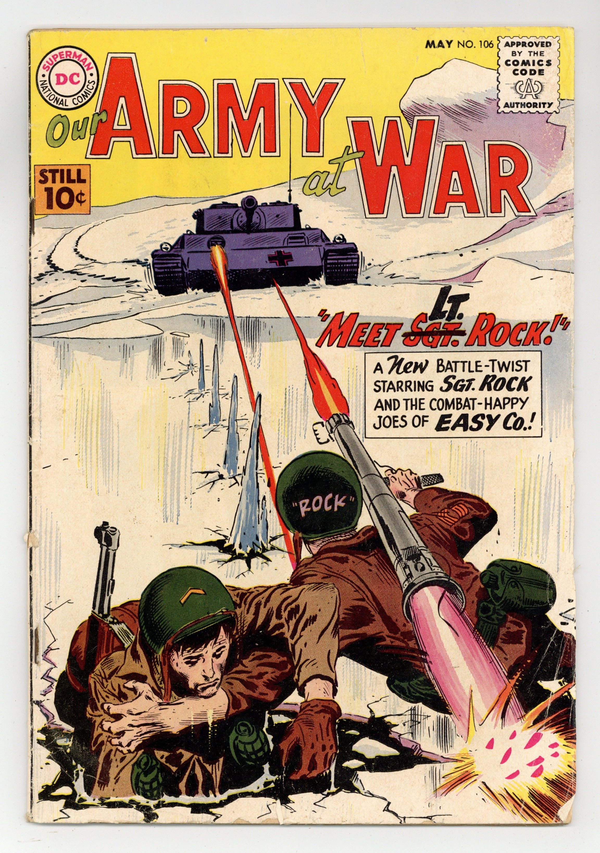 Cover art by Joe Kubert. Meet Lt. Rock starring Sgt Rock, script by Bob Kanigher, art by Irv Novick. Valley of Missing Aces, script by Bob Haney, pencils by Ross Andru, inks by Mike Esposito. 36 Pages, Full Color. Cover price $0.10. Grade: GD 2.0 explanation of grade Condition: Used (collectible)