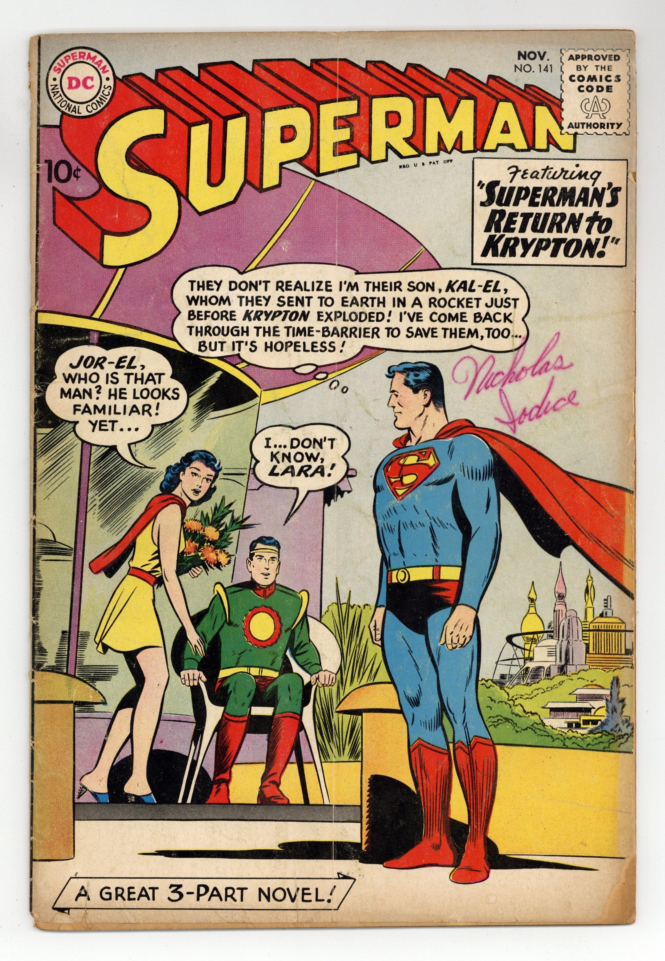 Cover pencils by Curt Swan, inks by Stan Kaye. Superman Meets Jor-El and Lara Again [Superman's Return to Krypton! part 1], script by Jerry Siegel, pencils by Wayne Boring, inks by Stan Kaye; Superman accidentally travels through time and across space to Krypton, where he meets actress Lyla Lerrol and his parents. Superman's Kryptonian Romance [Superman's Return to Krypton! part 2]; Superman romances Lyla and witnesses Jonathan Kent's proposal to Martha, while Brainiac shrinks and steals Kandor. The Surprise of Fate! [Superman's Return to Krypton! part 3]; Superman accidentally escapes Krypton, leaving behind Lyla. 36 Pages, Full Color. Cover price $0.10. Grade: GD- 1.8 explanation of grade Condition: Used (collectible)