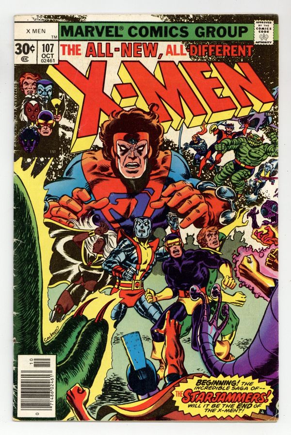 "Where No X-Man has Gone Before!" Part 2 of 3. Guest-starring the Starjammers (1st full appearance). Story by Chris Claremont. Art by Dave Cockrum and Dan Green. Story continued from Uncanny X-Men #105. Thanks to the awesome power of Phoenix, the X-Men have arrived on the far side of the universe. However things go from bad to worse when they are greeted by a small army of super-beings under the thrall of a sadistic madman. NOTE: 1st appearance of the Starjammers - Raza and Hepzibah - and the Shi'ar Imperial Guard. 36 pgs. Cover price $0.30. Grade: GD+ 2.5 explanation of grade Condition: Used (collectible)