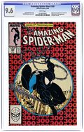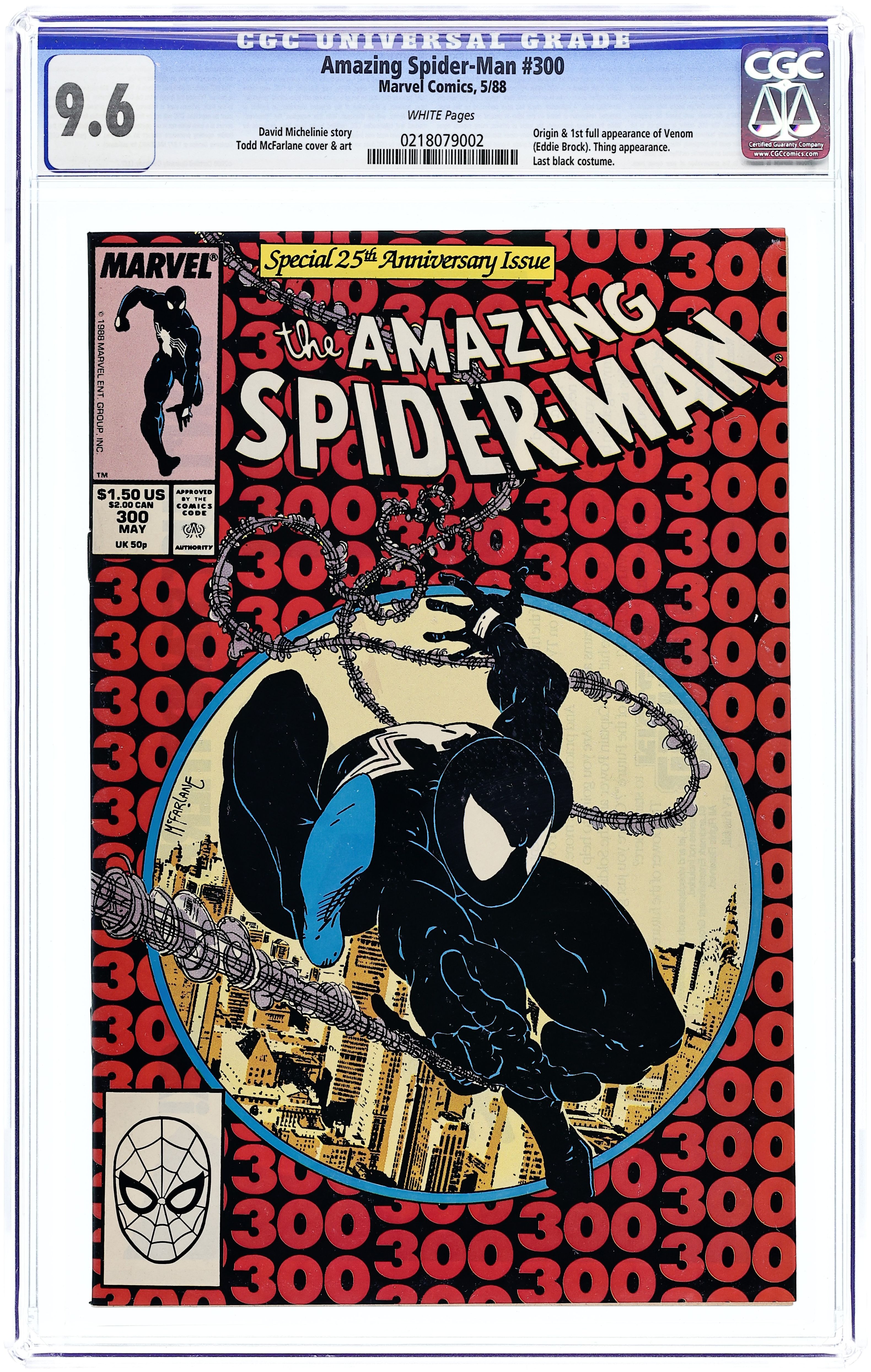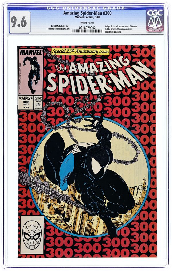 Starts Mar 2 Direct Edition. Giant-sized 25th anniversary issue. First full appearance of Venom in "Venom!", script by David Michelinie, art by Todd McFarlane; Spidey's old alien costume has merged with reporter Eddie Brock who thinks his career was ruined by Spider-Man and the symbiote of the two, Venom, takes on the web slinger; At MJ's request, Spidey returns to the blue and red costume as she now finds his black duds way too creepy; This is the last issue in which Spider-Man appears in his black costume; Thing (of the Fantastic Four) cameo.. Stan's Soapbox Special in place of letters page: Full page editorial by Stan on the occasion of Spider-Man's 300th issue. 52 pgs., full color. Cover price $1.50. Grade: CGC 9.6 explanation of grade Condition: Used (collectible)