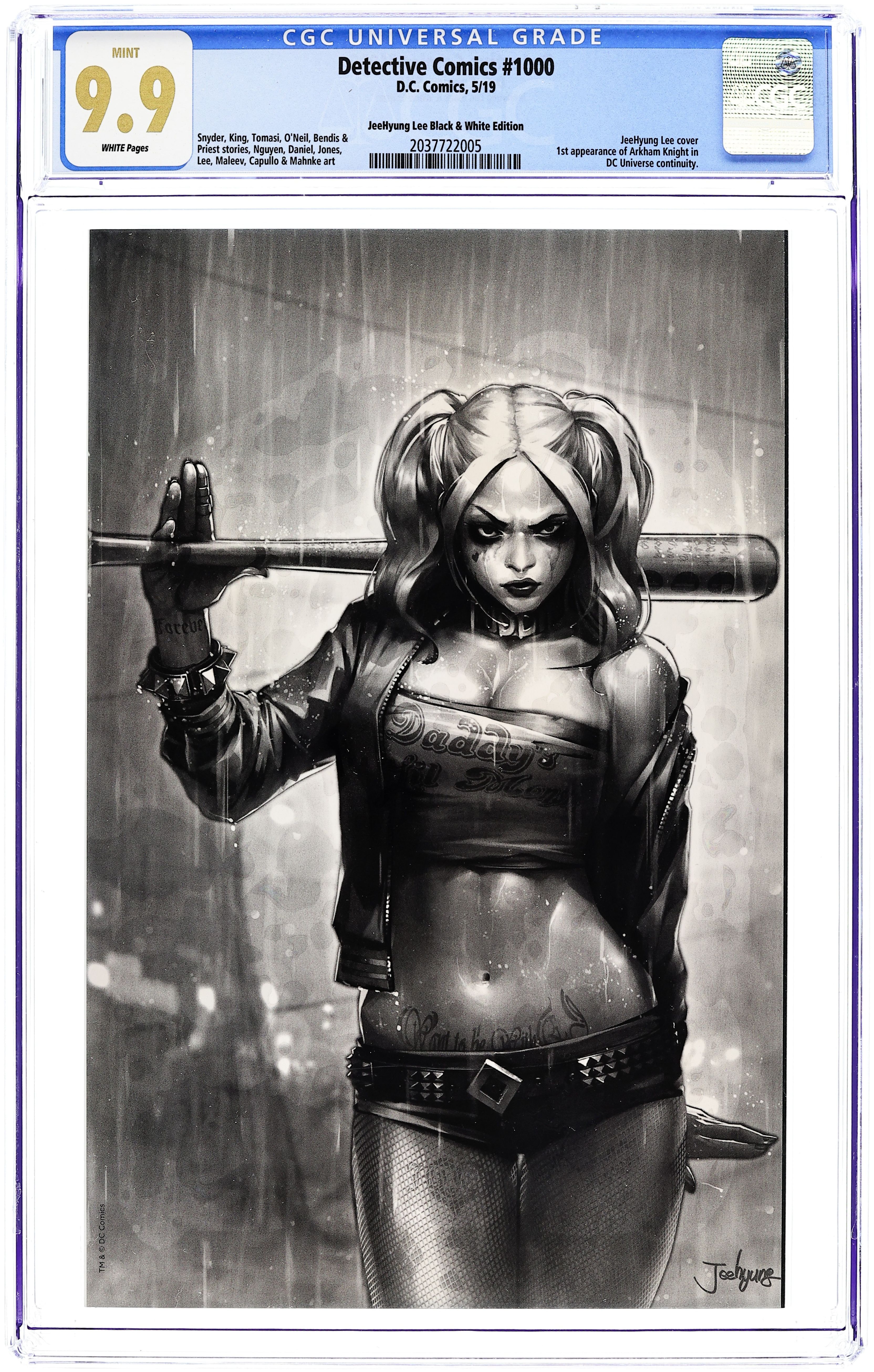 Forbidden Planet exclusive variant by JeeHyung Lee. Written by Scott Snyder, Kevin Smith, Paul Dini, Warren Ellis, Denny O'Neil, Christopher Priest, Brian Michael Bendis, Geoff Johns, James Tynion IV, Tom King and Peter J. Tomasi. Art by Greg Capullo, Jim Lee, Dustin Nguyen, Becky Cloonan, Steve Epting, Neal Adams, Alex Maleev, Kelley Jones, Álvaro Martínez-Bueno, Tony S. Daniel, Joëlle Jones, Doug Mahnke, Jonathan Glapion, Scott Williams, Derek Fridolfs, Raul Fernandez and Jaime Mendoza. After 80 years, it's here -- the 1,000th issue of DETECTIVE COMICS, the title that literally defines DC! This 96-page issue is stacked with an unbelievable lineup of talent that will take you on a journey through Batman's past, present and future...plus a sensational epilogue that features the first-ever DC Universe appearance of the deadly Arkham Knight! But who is under the mask? And why do they want Batman dead? The incredible future of Batman adventures begins here! Featuring: "Batman's Longest Case" by Scott Snyder, Greg Capullo and Jonathan Glapion; "Manufacture for Use" by Kevin Smith, Jim Lee and Scott Williams; "The Legend of Knute Brody" by Paul Dini, Dustin Nguyen and Derek Fridolfs; "The Batman's Design" by Warren Ellis and Becky Cloonan; "Return to Crime Alley" by Denny O'Neil and Steve Epting; "Heretic" by Christopher Priest and Neal Adams; "I Know" by Brian Michael Bendis and Alex Maleev; "The Last Crime in Gotham" by Geoff Johns and Kelley Jones; "The Precedent" by James Tynion IV, Álvaro Martínez-Bueno and Raul Fernandez; "Batman's Greatest Case" by Tom King, Tony S. Daniel and Joëlle Jones; and the Arkham Knight in "Medieval" by Peter J. Tomasi, Doug Mahnke and Jaime Mendoza (continues next issue). Plus pin-ups by Mikel Janín, Jason Fabok and Amanda Conner. 96 pages, full color. Rated T Grade: CGC 9.9 explanation of grade Condition: Used (collectible)