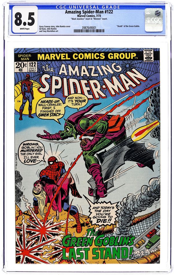 Double Insert Variant. Includes the Mark Jeweler Advertisement Centerfold Insert and the Mennen Advertisment Inner Cover Wrap Insert. In the previous issue, the Green Goblin kills Gwen Stacy, so in this issue, Spider-Man is out for blood! "The Goblin's Last Stand" has a script by Gerry Conway, pencils by Gil Kane, and inks by John Romita Sr. and Tony Mortellaro. The death scene of the Green Goblin (Norman Osborn) is stunning and inspired a similar moment in the 2002 Spider-Man movie. Romita cover. Reprinted in Marvel Tales # 99 and 192. Cover price $0.20. Grade: CGC 8.5 explanation of grade Condition: Used (collectible)