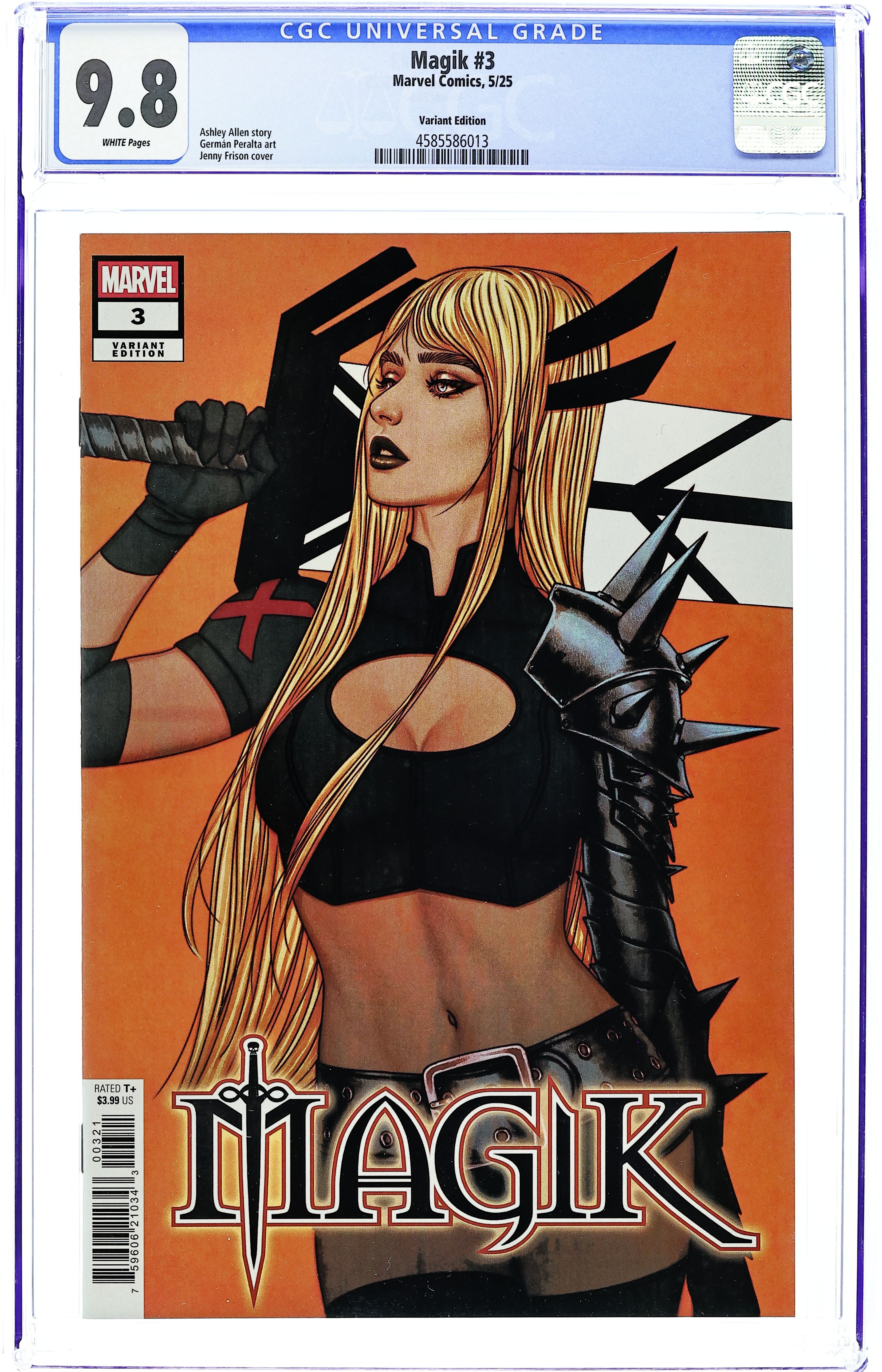 Written by Ashley Allen. Art by German Peralta. Cover by Jenny Frison. Demons have been hunting mutants abroad. Magik finally meets leader of the demons. Who or what is LIMINAL? And will Magik be able to suppress her darker impulses? 28 pages, full color. Rated T+ Cover price $3.99. Grade: CGC 9.8 explanation of grade Condition: Used (collectible) unless item is a new release