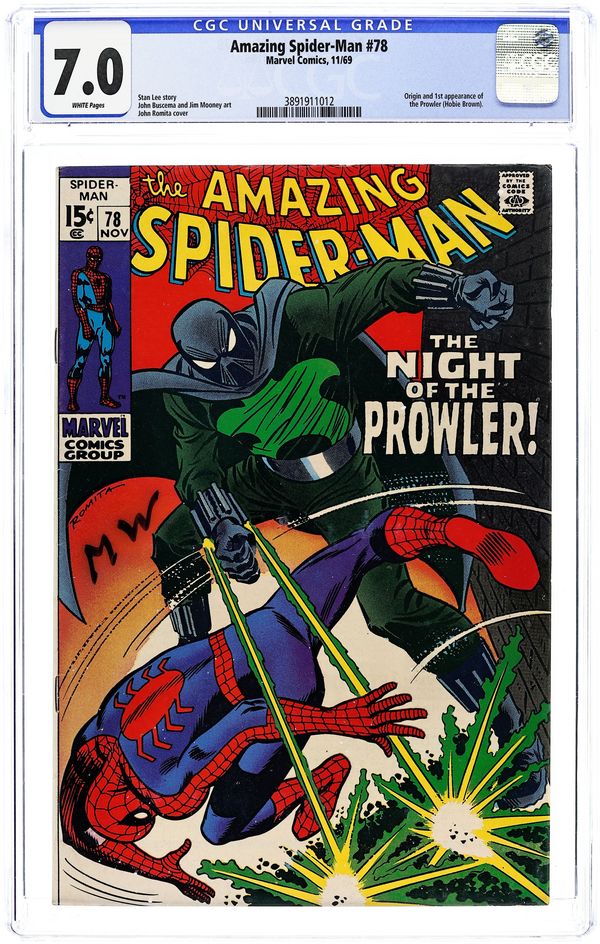 First appearance of the Prowler in "The Night of the Prowler!" Part 1 of 2. Script by Stan Lee. Art by John Buscema (layouts) and Jim Mooney (finishes). Cover by John Romita. In order to make a name for himself, a down on his luck window washer named Hobie Brown becomes a super-villain. And using his own ideas and equipment, Hobie creates weapons and a costume -- and the Prowler is born! In the meantime, Peter Parker is also feeling downtrodden after seeing Gwen Stacy and Flash Thompson having coffee together. Later that evening, Peter stops by the Daily Bugle hoping for a payday advance. But instead he sees the Prowler stealing the Bugle's payroll bag! And suddenly it's the Prowler vs. Peter Parker...with J. Jonah Jameson standing by! Origin of the Prowler. Cameo appearances by Harry Osborn, Joe Robertson, and Mindy Brown. (Note: This story was reprinted in Marvel Tales #59.) 36 pages. Cover price $0.15. Grade: CGC 7.0 explanation of grade Condition: Used (collectible)