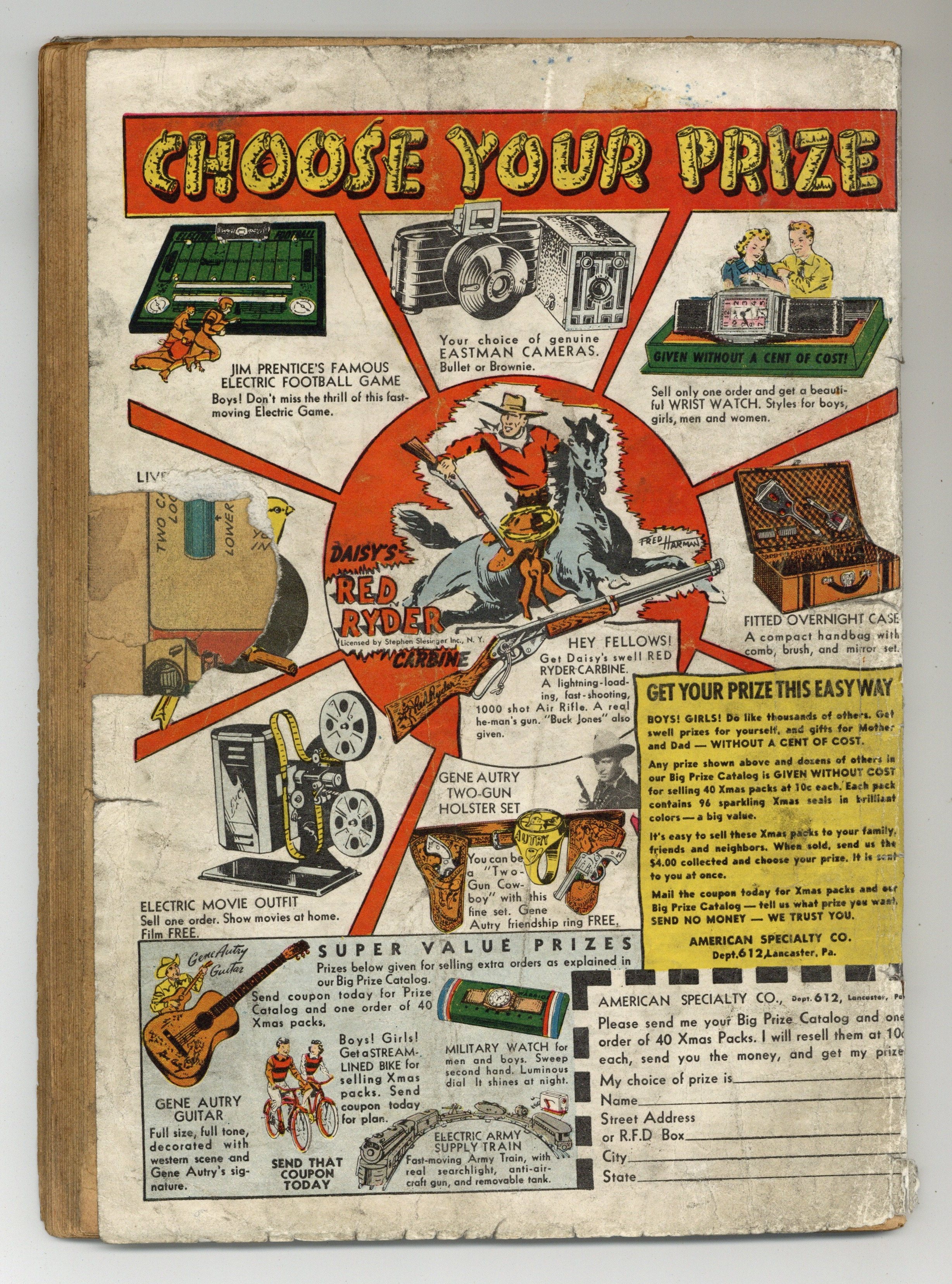 Starts Apr 4 Cover pencils by C. C. Beck. "The Bal Masque," art by C. C. Beck; Billy and Whitey return from their adventure in Guatemala (where they battled the Mayan monkey-god) and receive a note from Mr. Morris to meet him in Washington D.C. in regards to a secret mission; They are instructed to meet the radio station owner at a masked ball, and he introduces the pair to the ambassador and his daughter. "The Man Who Bet the Ranch on Golden Arrow." "Crack Shot" text story, art by Joseph J. Millard. "Hunt for the Sea Raider," art by Lance O'Casey. "Schtinker's Mosquito Murders" starring Spy Smasher, art by Charles Sultan. Untitled Chubby story, script and art by Tom McNamara. "Battle on the Sea" staring Dr. Voodoo, art by George Tuska; Hal and Nero catch up to and board Svenson's ship; They make their way to the cabin where Anita is being held and then are set upon by the pirates. "Sacrifice to the Angry God," art by Ibis the Invincible. 68 Pages, Full Color. Cover price $0.10. Grade: PR 0.5 explanation of grade Condition: Used (collectible)
