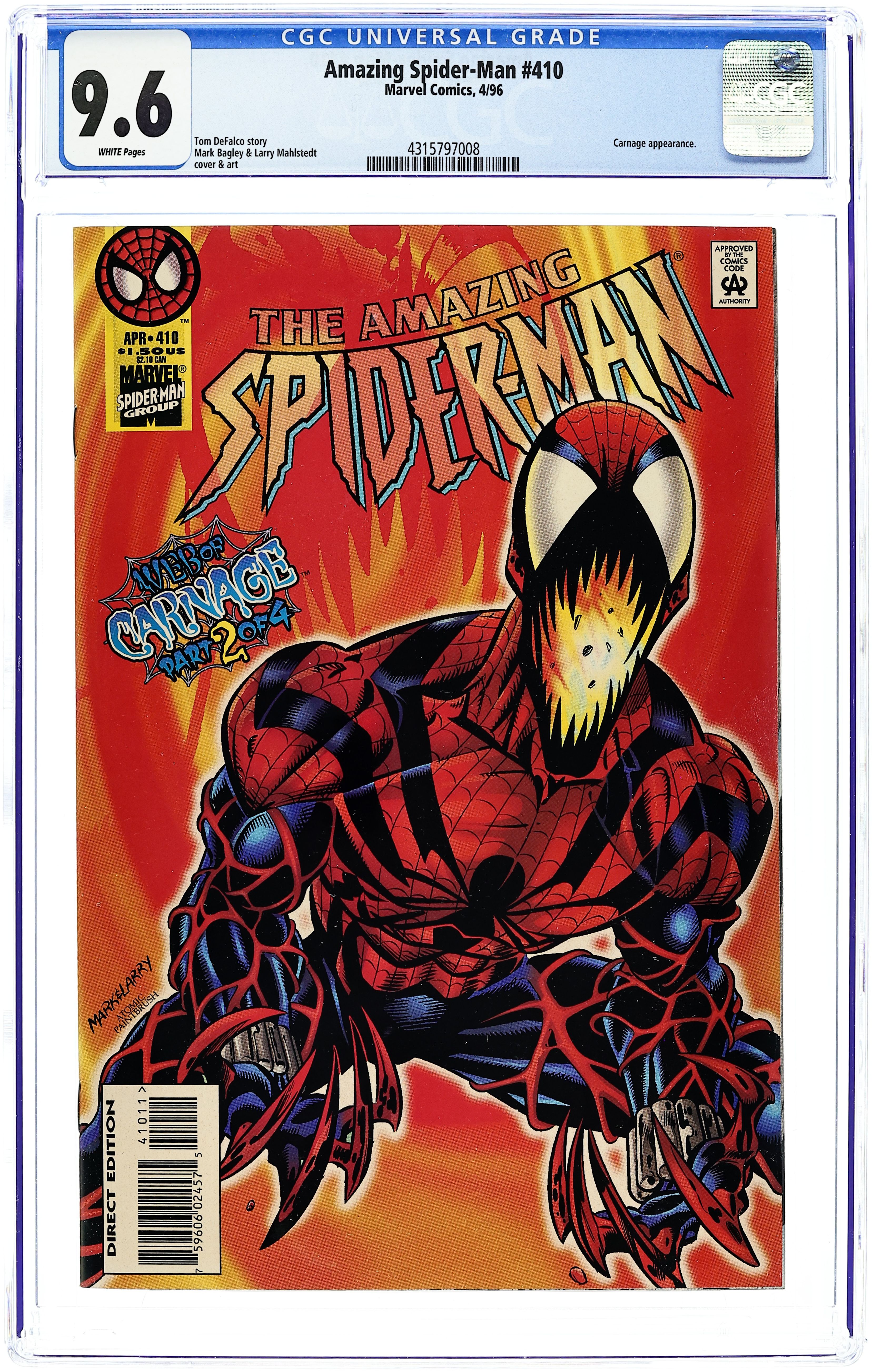 Direct Edition. Cover pencils by Mark Bagley, inks by Larry Mahlstedt. It's Carnage versus Spidey in Web of Carnage Part 2 of 4, "And Now - Spider-Carnage," script by Tom DeFalco, pencils by Mark Bagley, inks by Larry Malhstedt and Randy Emberlin; Spidey and Peter learn the Spider-skeleton is an actual Spider-Man clone and that Ben's girlfriend Jessica Carradine is the Burglar's daughter (SenSM #3, '96); Meanwhile, Carnage terrorizes the city even though Cletus Kasady is safe in his cell; Seeking answers, Spidey follows Ravencroft guard Dickerson to an underground super-villain-worshipping club where Dickerson sells Carnage memorabilia filched from Ravencroft; Carnage attacks the club, and battles Spidey, escaping after bringing down the roof; At the Daily Bugle, Jessica gets a job to photograph Spidey as a public menace; Spidey tails Ravencroft security chief John Jameson, discovering him possessed by the Carnage symbiote. The story continues from Sensational Spider-Man 3 and continues in Spider-Man 67. 36 pgs., full color. $1.50. Cover price $1.50. Grade: CGC 9.6 explanation of grade Condition: Used (collectible)