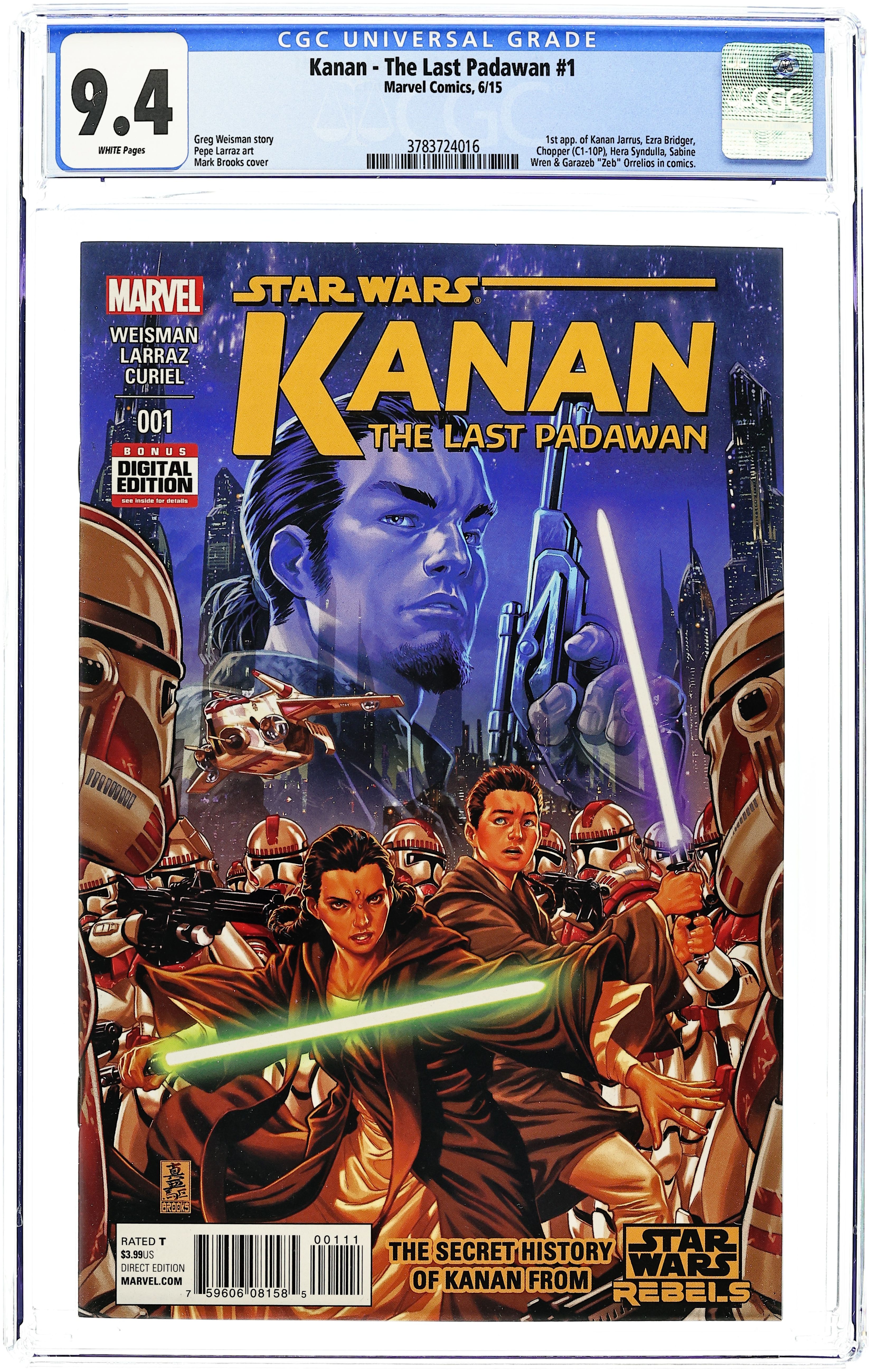 Written by Greg Weisman. Art by Pepe Larraz. Cover by Mark Brooks. Kanan Jarrus--in STAR WARS REBELS, he's a cocky, sarcastic renegade fighting against the Galactic Empire alongside the rag-tag crew of the Ghost...but years before, at the height of the Clone Wars, he was known as Caleb Dume, Jedi Padawan under the instruction of Jedi Master Depa Billaba. Neither master nor apprentice ever suspected that the Clone Troopers they commanded would turn on them upon the issuing of Order 66-the order to execute all Jedi. How did Caleb Dume survive? How did he learn to survive on his own? And how did he become the man we know as Kanan Jarrus? A tale bridging the years between the Clone Wars and Rebels! 28 pages, full color. Rated T. Star Wars Lucasfilm Ltd. & TM. All rights reserved. Used under authorization. Text and illustrations for Star Wars are 2015 Lucasfilm Ltd. Cover price $3.99. Grade: CGC 9.4 explanation of grade Condition: Used (collectible)