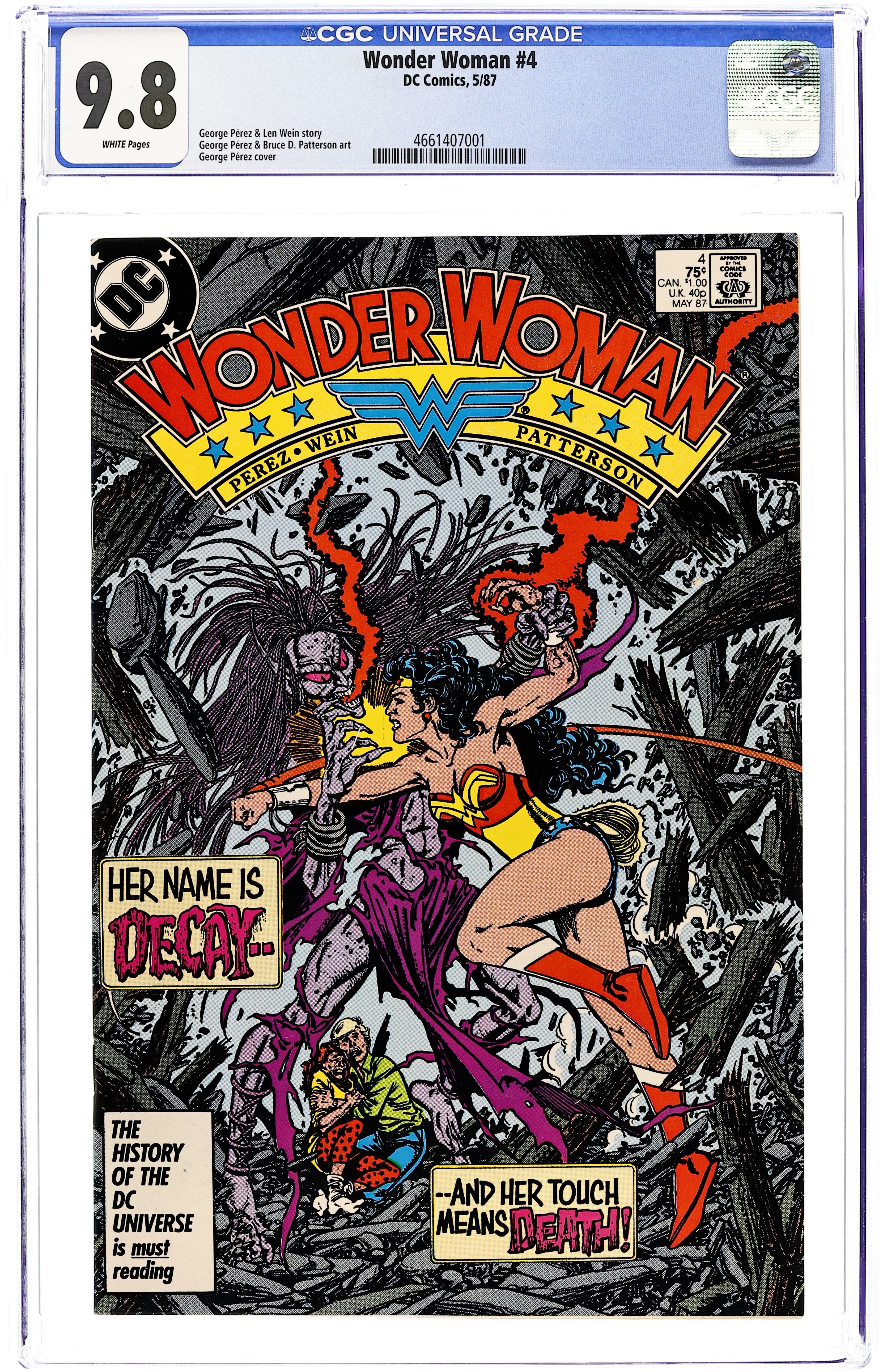 Starts Mar 2 Medusa's daughter Decay's rampage across Boston puts Diana in the front-page headlines in "A Long Day's Journey into Fright!" Part 4 of 6, continued from the previous issue. Story continues next issue. Script by Len Wein, plot and pencils by George Perez, inks by Bruce Patterson. Perez cover. 36 pgs. Cover price $0.75. Grade: CGC 9.8 explanation of grade Condition: Used (collectible)