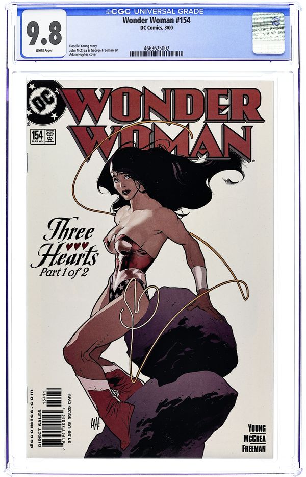 WRITTEN BY DOSELLE YOUNG; ART BY JOHN MCCREA AND GEORGE FREEMAN; COVER BY ADAM HUGHES In stores January 26. Part 1 of the 2-part "Three Hearts." Wonder Woman joins forces with the lost Amazon Nu'Bia (from summer's WONDER WOMAN ANNUAL #8) to battle the forces of Ahriman, the Prince of Lies, in an effort to free Nu'Bia's lost love from his entrapment. FC, 40 PG." Cover price $1.99. Grade: CGC 9.8 explanation of grade Condition: Used (collectible)