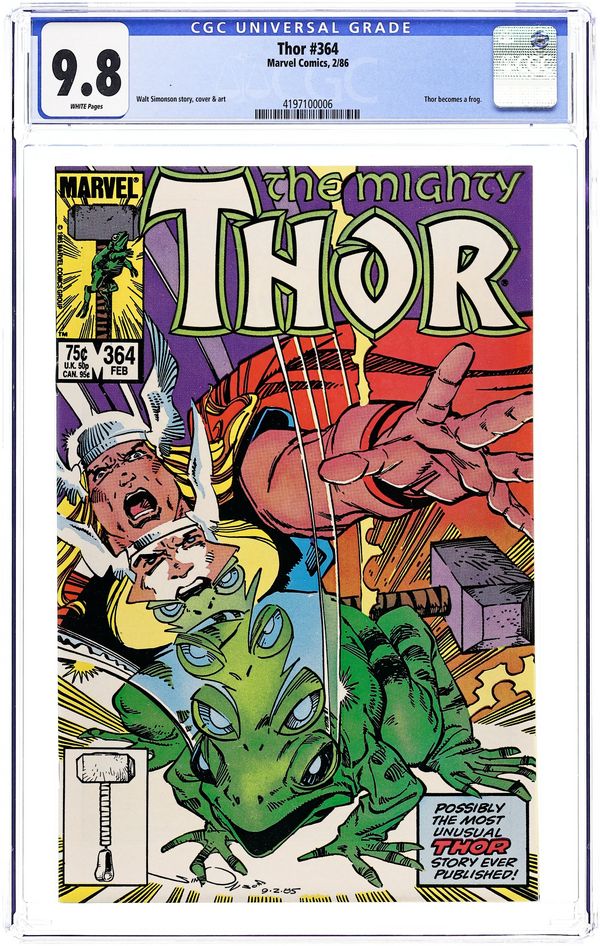 Starts Apr 4 First 75-cent cover price. Cover by Walt Simonson. "Thor Croaks," script and art by Walt Simonson; Asgard is holding the Althing to determine who will be her next ruler, but where is the mighty Thor?; Thanks to a spell by Loki, Thor is a frog living in Central Park who joins more of his kind in a battle with some sinister rats; Hildy finds the sword of Surtur. Appearances by Beta Ray Bill, Sif, Hogun, Fandral, Volstagg, and Heimdall. Bullpen Bulletins. 36 pgs., full color. $0.75. Cover price $0.75. Grade: CGC 9.8 explanation of grade Condition: Used (collectible)