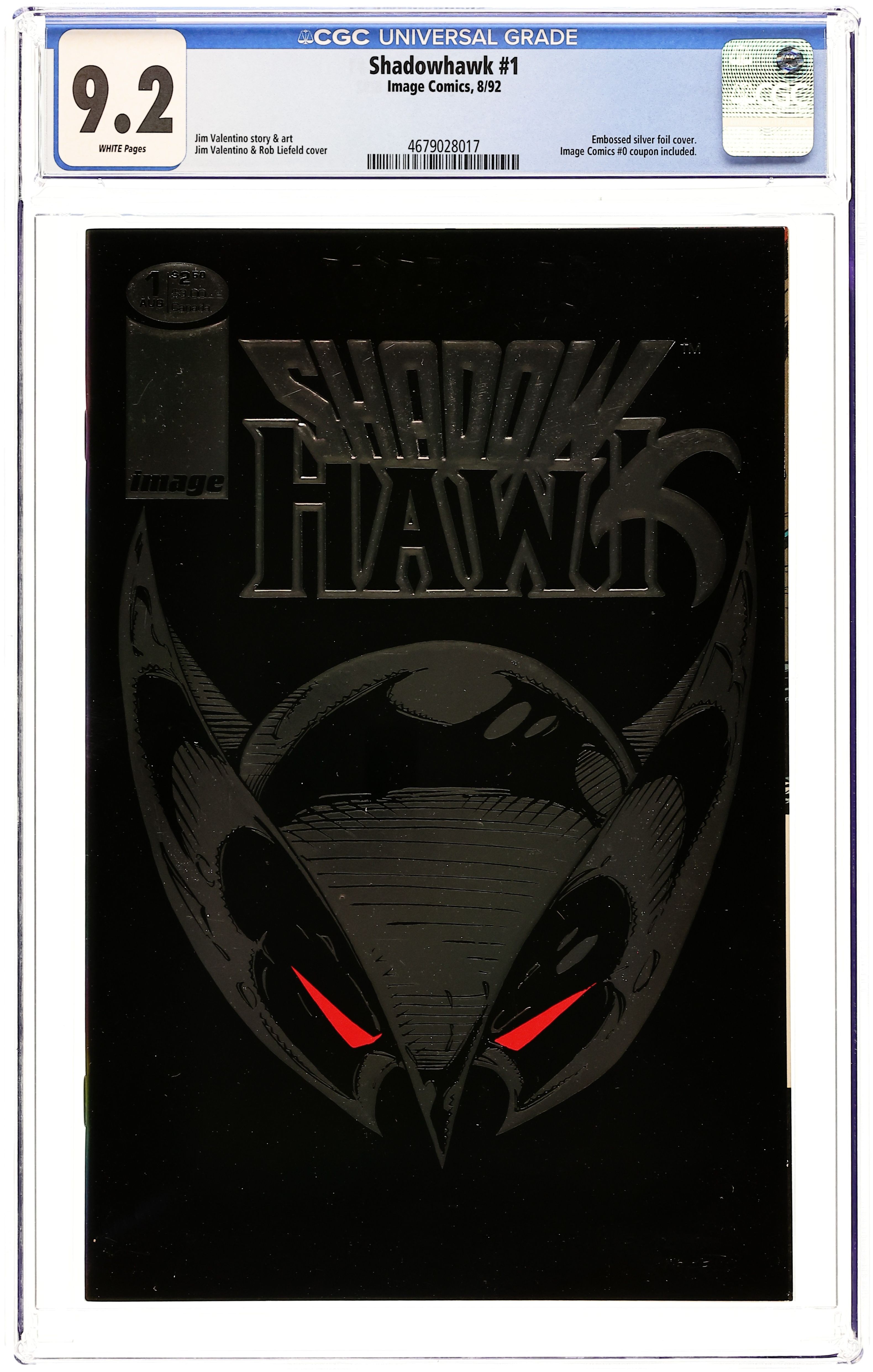 Silver embossed cover - Cover pencils by Jim Valentino, inks by Rob Liefeld. A Nightmare Walking, script and art by Jim Valentino; A deadly new hero prowls the night, breaking the backs of street criminals to teach them a lesson; The police try to capture him but can't even get close enough to get a good look at him; Who is Shadowhawk? Jim's First Drawing of Shadowhawk illustration. Cover price $2.50. Grade: CGC 9.2 explanation of grade Condition: Used (collectible)