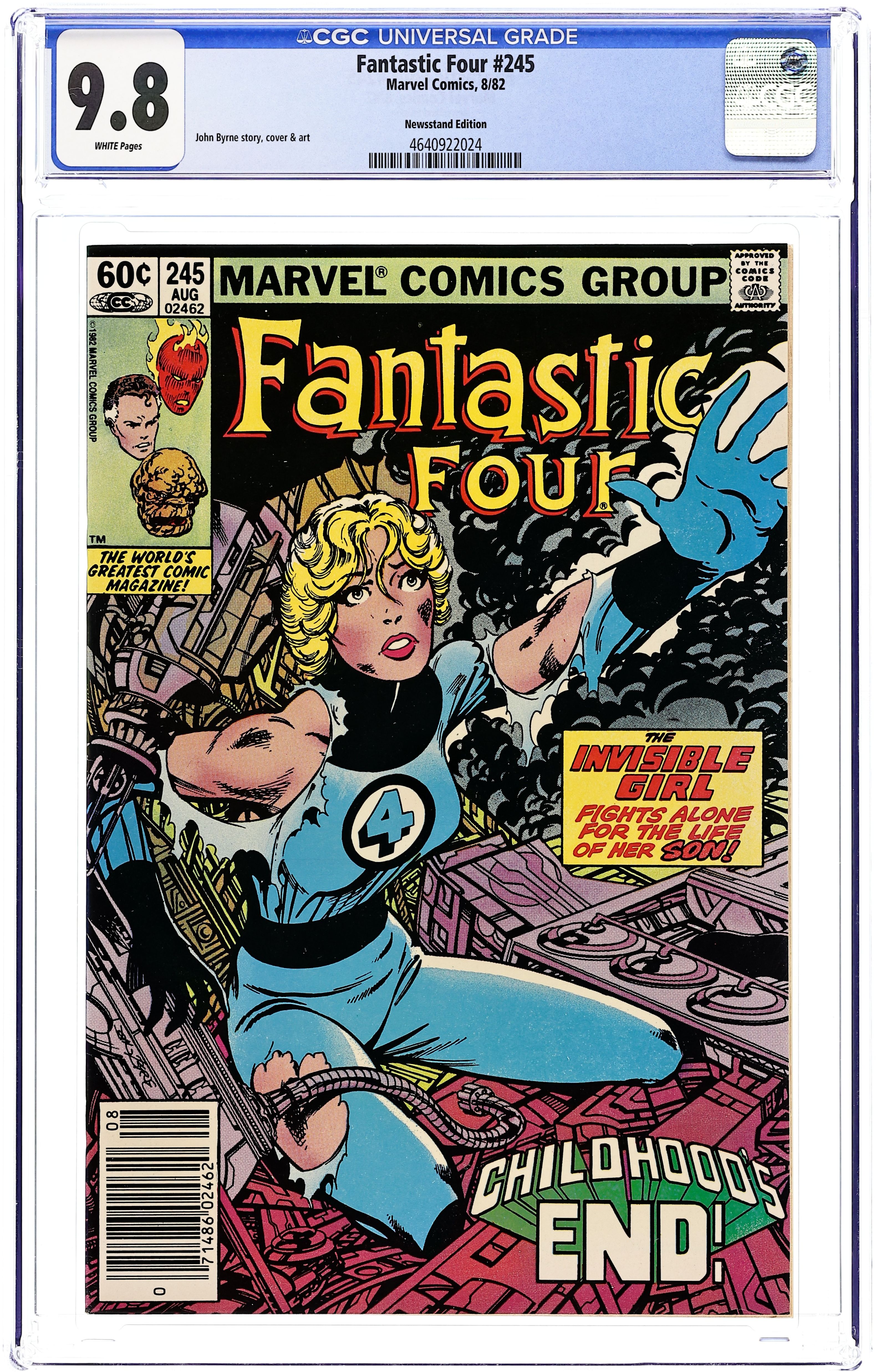Newsstand Edition. "Childhood's End" Script and Art by John Byrne. Cover by John Byrne. While Sue tapes an interview for a local TV show, a tragedy unfolds at the Baxter Building. And by the time the Invisible Girl arrives back home; Reed, Ben, and Johnny have been knocked out by a tall, blonde-haired stranger with amazing powers! Who is this man? Can the Invisible Girl provide the answers to his questions? 36 pages Cover price $0.60. Grade: CGC 9.8 explanation of grade Condition: Used (collectible)