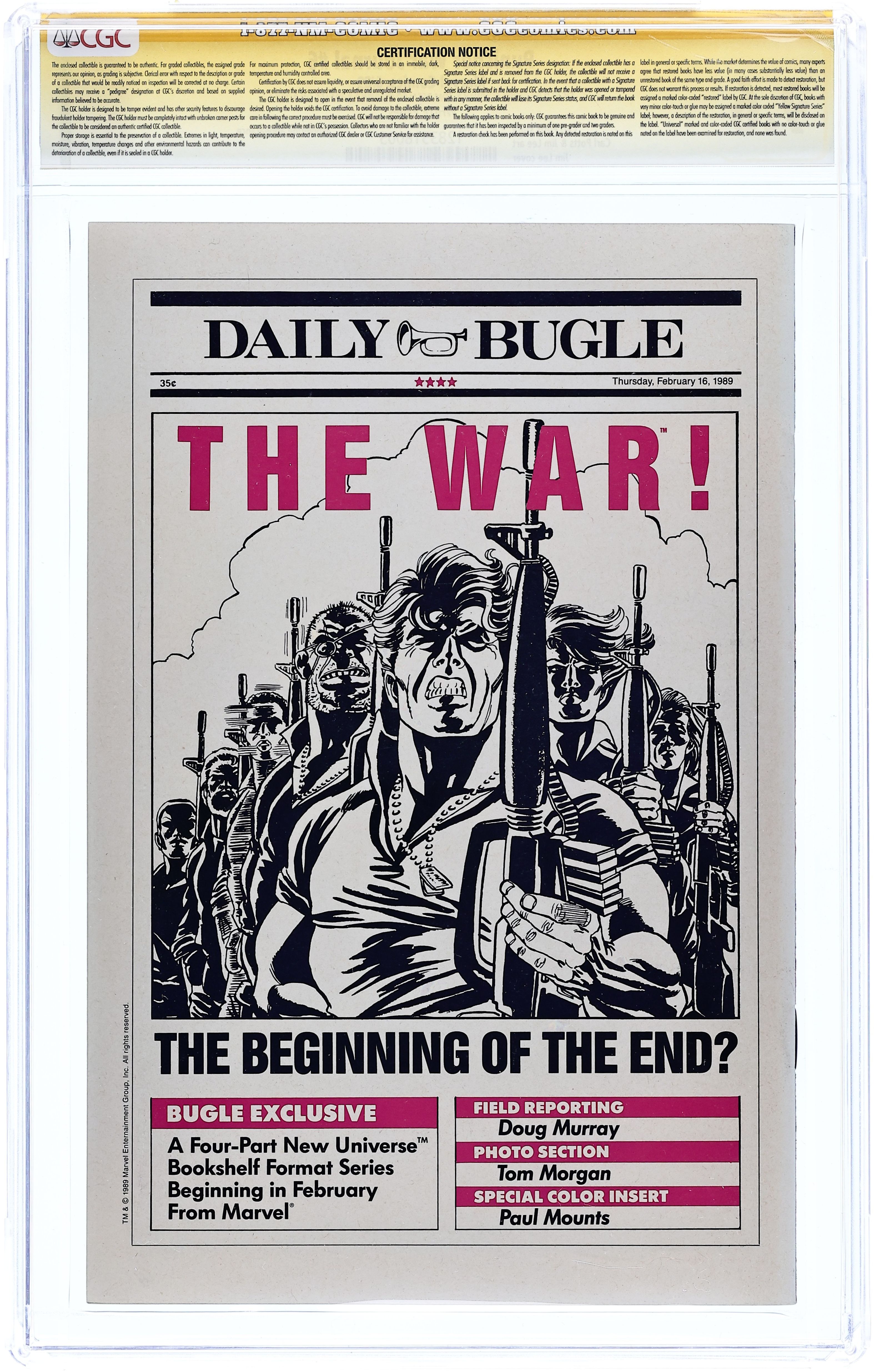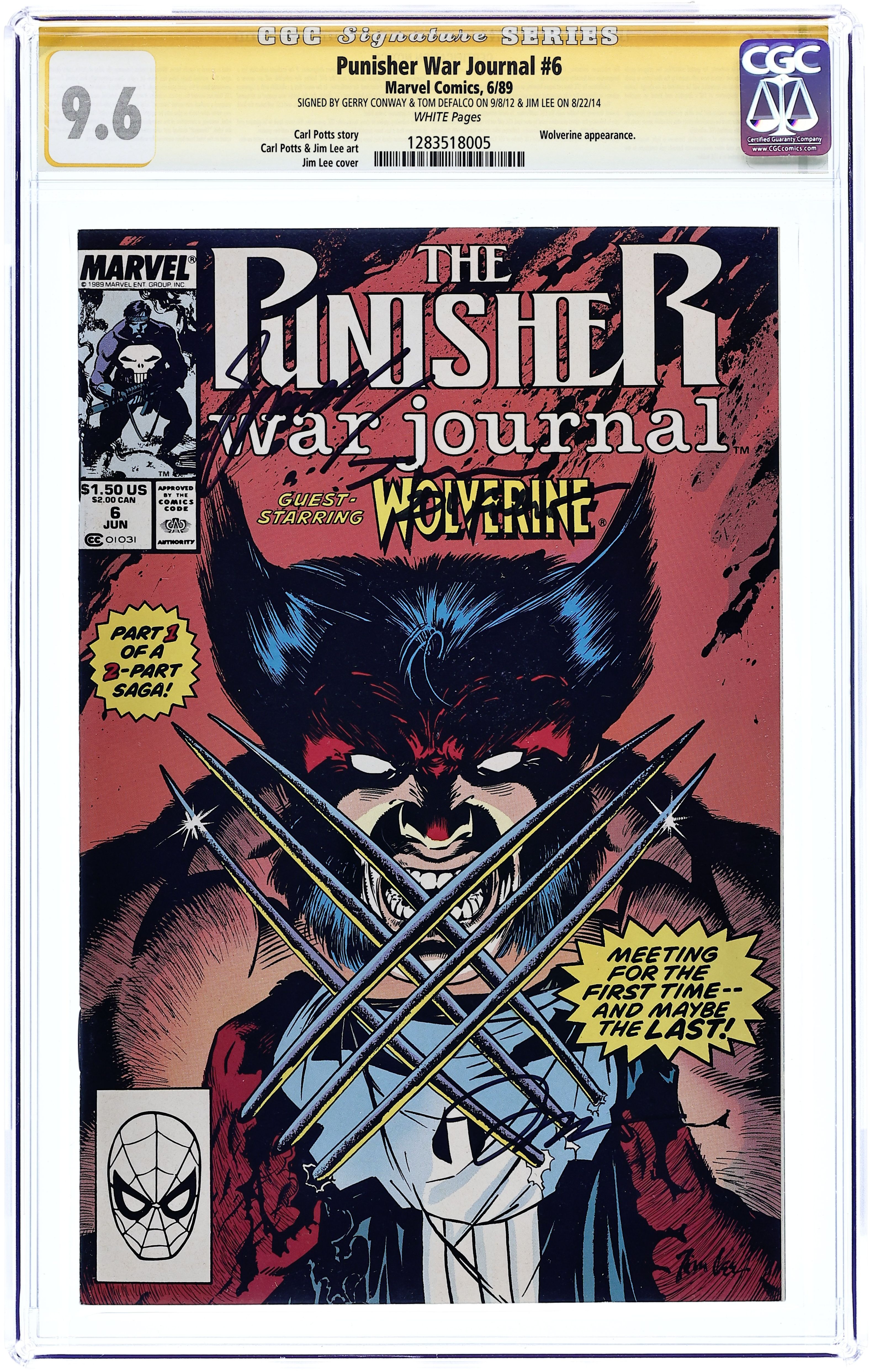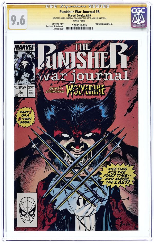 Starts Mar 9 Direct Edition. Cover art by Jim Lee. On the Track of Unknown Animals, script by Carl Potts, pencils by Carl Potts and Jim Lee, inks by Jim Lee; at Microchip's behest, Punisher goes to Africa as part of a dinosaur hunting expedition; Punisher battles Wolverine in the African jungle. 36 pgs. $1.50. Cover price $1.50. Grade: CGC 9.6 explanation of grade Condition: Used (collectible)