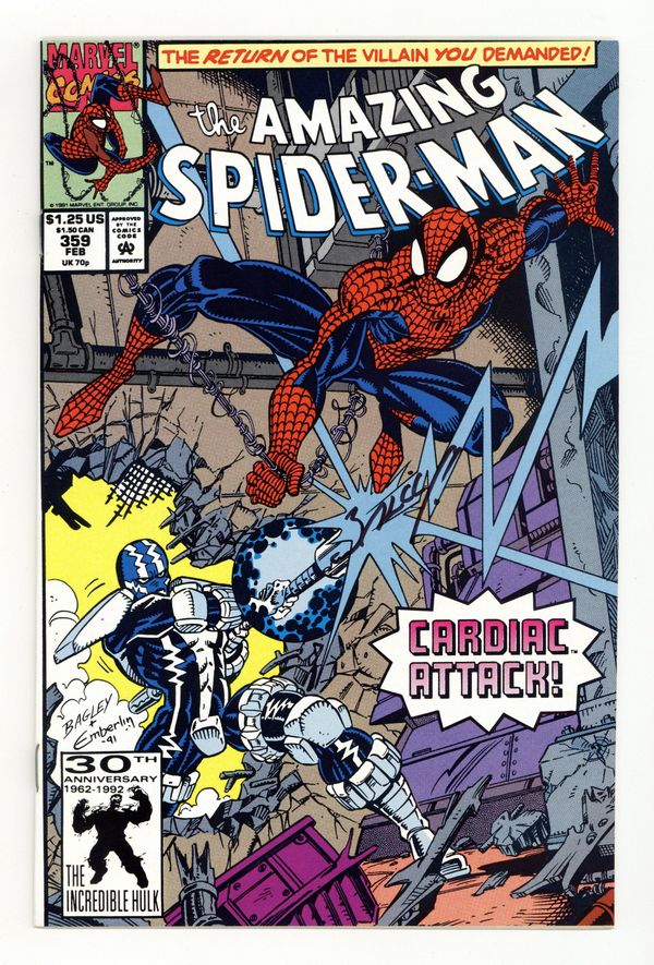 Starts Mar 9 Direct Edition. First $1.25 cover price. "Toy Death!" Part 1 of 2. Script by David Michelinie. Pencils by Chris Marrinan. Inks by Keith Williams. Cover by Mark Bagley and Randy Emberlin. Cardiac is back! And bringing his own brand of justice to the Big Apple! Each day Dr. Elias Wirtham reads the latest corporate exposé in the Daily Bugle...and then goes after that company the following night! But Ben Urich and Peter Parker have caught on to Cardiac's pattern! So the next evening the web-slinger hides away in the manufacturing plant of a corrupt toymaker! Waiting for his very own...Cardiac attack! Cameo appearances by Cletus Kasady, Mary Jane Watson, Flash Thompson, J. Jonah Jameson, and the Black Cat. First $1.25 issue. (Note: The letters page previews the cover to Amazing Spider-Man 361.) 36 pages. Cover price $1.25. Grade: VF 8.0 explanation of grade Condition: Used (collectible)