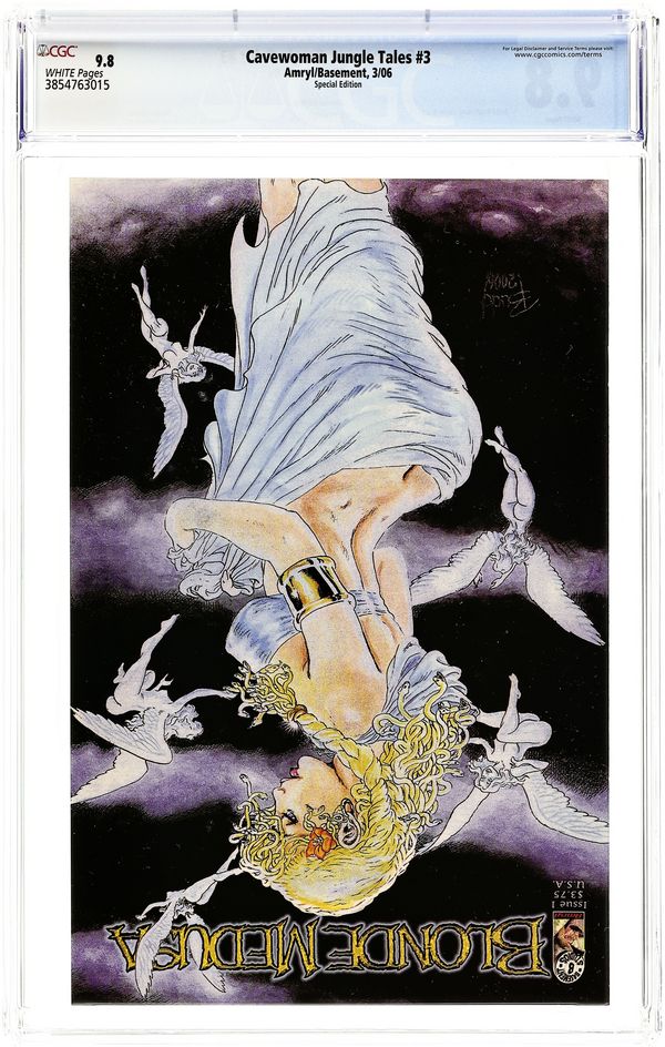 Beatles variant cover by Budd Root, limited to 750 copies. Story and art by Budd Root. Early adventures of voluptuous superwoman Meriem Cooper, who battles dinosaurs in the distant past. Meriem meets the Beatles and has other oddball adventures in the jungle. On the reverse side, the Blonde Medusa seeks a lost child. 24 pages, B&W. Mature readers. Grade: CGC 9.8 explanation of grade Condition: Used (collectible)